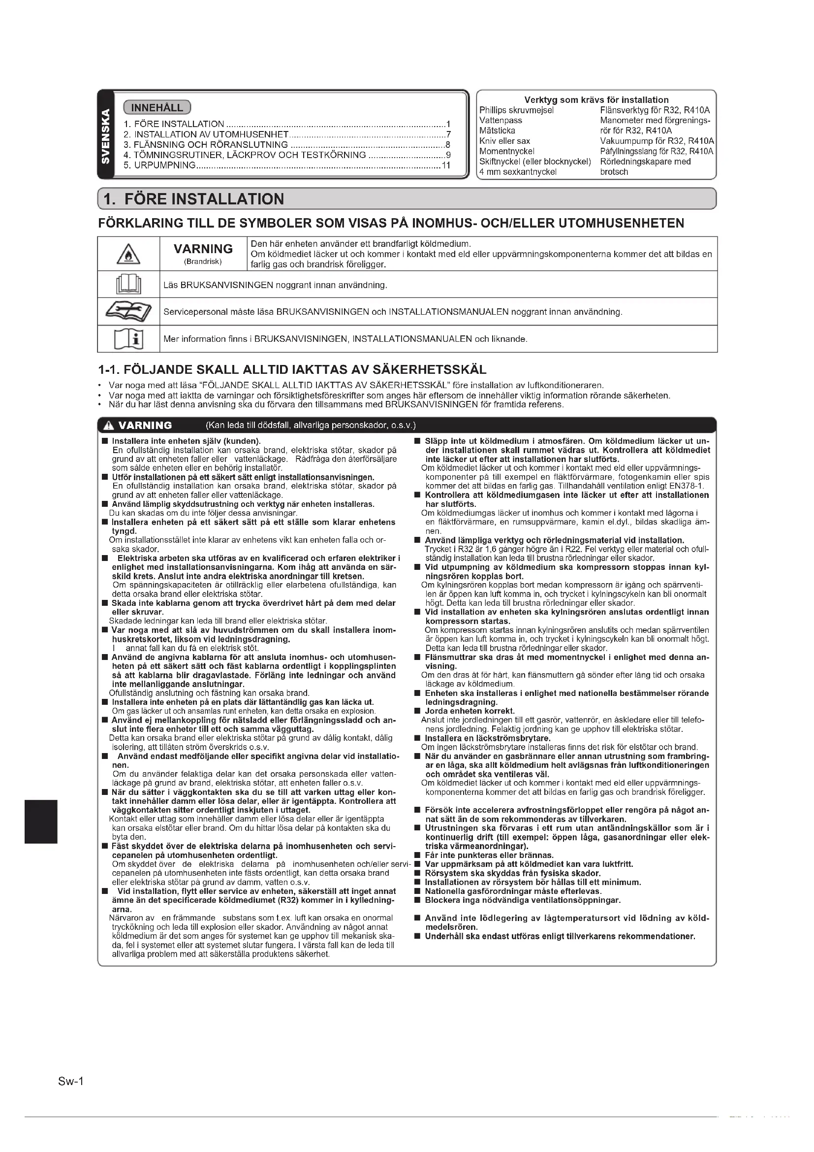 Använd inte lödlegering av lågtemperatursort vid lödning av köld- medelsrören. Underhåll ska endast utföras enligt tillverkarens rekommendationer. VARNING (Kanledatilldödsfall,allvarligapersonskador,o.s.v.) Verktyg som krävs för installation Phillipsskruvmejsel Vattenpass Mätsticka Knivellersax Momentnyckel Skiftnyckel(ellerblocknyckel) 4mmsexkantnyckel FlänsverktygförR32,R410A Manometermedförgrenings- rörförR32,R410A VakuumpumpförR32,R410A PåfyllningsslangförR32,R410A Rörledningskaparemed brotsch SVENSKA FÖRKLARING TILL DE SYMBOLER SOM VISAS PÅ INOMHUS- OCH/ELLER UTOMHUSENHETEN VARNING (Brandrisk) Denhärenhetenanvänderettbrandfarligtköldmedium. Omköldmedietläckerutochkommerikontaktmedeldelleruppvärmningskomponenternakommerdetattbildasen farliggasochbrandriskföreligger. LäsBRUKSANVISNINGENnoggrantinnananvändning. ServicepersonalmåsteläsaBRUKSANVISNINGENochINSTALLATIONSMANUALENnoggrantinnananvändning. MerinformationnnsiBRUKSANVISNINGEN,INSTALLATIONSMANUALENochliknande. INNEHÅLL 1.FÖREINSTALLATION........................................................................................1 2.INSTALLATIONAVUTOMHUSENHET...............................................................7