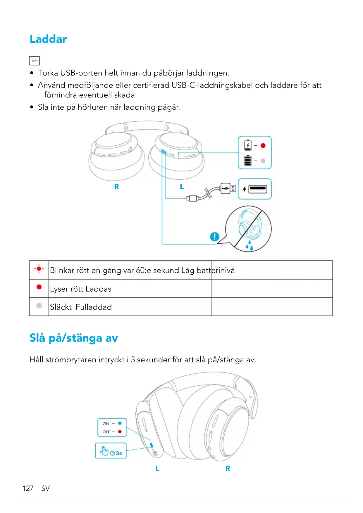 - Slå inte på hörluren när laddning pågår. R L Blinkar rött en gång var 60:e sekund Låg batterinivå Lyser rött Laddas Släckt Fulladdad Slå på/stänga av Håll strömbrytaren intryckt i 3 sekunder för att slå på/stänga av.