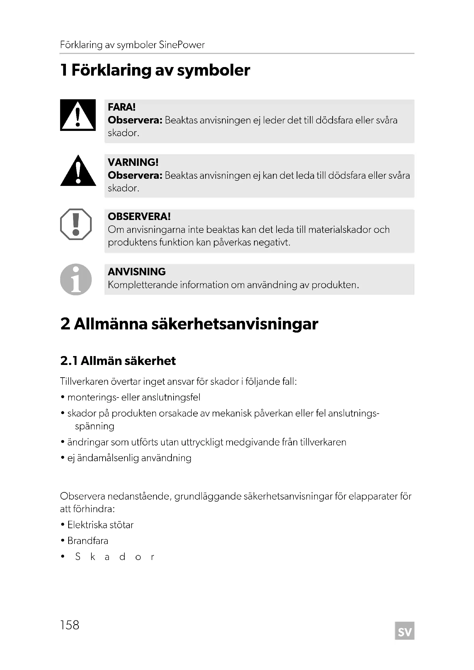 - Skador FARA! Observera: Beaktas anvisningen ej leder det till dödsfara eller svåra skador. VARNING! Observera: Beaktas anvisningen ej kan det leda till dödsfara eller svåra skador. OBSERVERA! Om anvisningarna inte beaktas kan det leda till materialskador och produktens funktion kan påverkas negativt. ANVISNING Kompletterande information om användning av produkten. DSP600-2000--IO-16s.book Seite 158 Montag, 7. Mai 2018 1:39 13SV SinePower Allmänna säkerhetsanvisningar