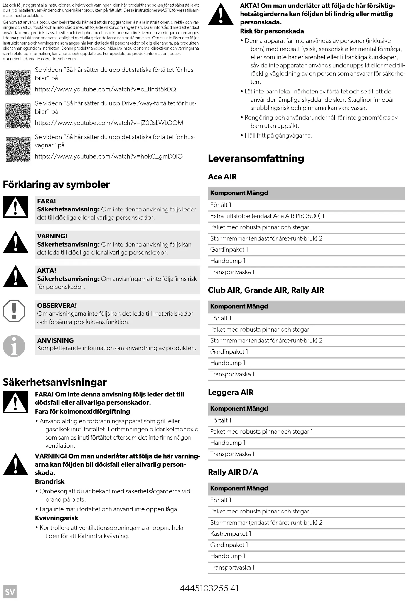 - Håll fritt på gångvägarna. Leveransomfattning Ace AIR Club AIR, Grande AIR, Rally AIR Leggera AIR Rally AIR D/A Se videon ”Så här sätter du upp det statiska förtältet för hus- bilar” på https://www.youtube.com/watch?v=o_tIndt5k0Q Se videon ”Så här sätter du upp Drive Away-förtältet för hus- bilar” på https://www.youtube.com/watch?v=jZ00sLWLQQM Se videon ”Så här sätter du upp det statiska förtältet för hus- vagnar” på https://www.youtube.com/watch?v=hokC_gmD0lQ FARA! Säkerhetsanvisning: Om inte denna anvisning följs leder det till dödliga eller allvarliga personskador. VARNING! Säkerhetsanvisning: Om inte denna anvisning följs kan det leda till dödliga eller allvarliga personskador. AKTA! Säkerhetsanvisning: Om anvisningarna inte följs finns risk för personskador. OBSERVERA! Om anvisningarna inte följs kan det leda till materialskador och försämra produktens funktion. ANVISNING Kompletterande information om användning av produkten. Komponent Mängd Förtält 1 Extra luftstolpe (endast Ace AIR PRO500) 1 Paket med robusta pinnar och stegar 1 Stormremmar (endast för året-runt-bruk) 2 Gardinpaket 1 Handpump 1 Transportväska 1 Komponent Mängd Förtält 1 Paket med robusta pinnar och stegar 1 Stormremmar (endast för året-runt-bruk) 2 Gardinpaket 1 Handpump 1 Transportväska 1 Komponent Mängd Förtält 1 Paket med robusta pinnar och stegar 1 Handpump 1 Transportväska 1 Komponent Mängd Förtält 1 Paket med robusta pinnar och stegar 1 Stormremmar (endast för året-runt-bruk) 2 Kastrempaket 1 Gardinpaket 1 Handpump 1 Transportväska 1SV