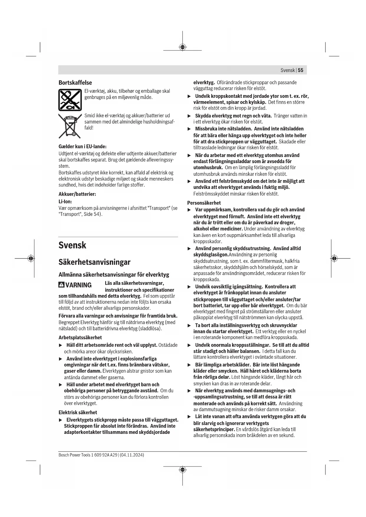 Den vibrationsnivå och det bullervärde som anges i dessa anvisningar har uppmätts enligt en mätmetod som normerats och kan användas för att jämföra elverktyg med varandra. Mätmetoden är även lämplig för preliminär bedömning av vibrations- och bullernivån. Den angivna vibrations- och bullernivån representerar den huvudsakliga användningen av elverktyget. Om däremot elverktyget används för andra ändamål, med andra insatsverktyg eller inte underhållits ordentligt kan vibrations- och bullernivån avvika. Då kan vibrations- och bullernivån under arbetsperioden öka betydligt under hela arbetstiden. För en exakt bedömning av vibrations- och bullernivån bör även de tider beaktas när elverktyget är avstängt eller är igång, men inte används. Detta reducerar vibrations- och bullerbelastningen för den totala arbetsperioden betydligt. Bestäm extra säkerhetsåtgärder för att skydda operatören mot vibrationernas inverkan t.ex.: underhåll av elverktyget Bosch Power Tools 1 609 92A A29 | (04.11.2024)58 | Svensk och insatsverktygen, att hålla händerna varma, organisation av arbetsförloppen. Batteri Ladda batteriet u Använd endast de laddare som anges i tekniska data. Endast denna typ av laddare är anpassad till det litium- jonbatteri som används i elverktyget. Observera: litiumjonbatterier levereras delvis laddade enligt internationella transportföreskrifter. För full effekt ska batteriet laddas helt innan första användningen. Sätta in batteriet Skjut in det laddade batteriet i batterihållaren tills det sitter fast. Borttagning av batteri För att ta ut batteriet, tryck på upplåsningsknappen och dra ut batteriet. Bruka inte våld. Batteriet är försedd med två låssteg som hindrar ackumulatorn från att falla ut om dess upplåsningsknappfaller ut. När batteriet är insatt i elverktyget hålls det med en fjäder i rätt läge. Indikering batteristatus Indikeringen för batteristatus (5) på elverktyget består av tre gröna LED-lampor. Den visar batteriets laddningsstatus under några sekunder efter starten och avstängningen. LED Kapacitet Fast ljus 3x grön 60 – 100% Fast ljus 2x grön 30 – 60% Fast ljus 1x grön 10 – 30% Långsam blinkning 1x grön 0 – 10% De 3 LED-lamporna för batteristatus blinkar snabbt när batteriets temperatur ligger utanför driftstemperaturområdet på –30 till +70 °C och/eller överbelastningsskyddet har utlösts. Anvisningar för korrekt hantering av batterimodulen Skydda batterimodulen mot fukt och vatten. Batteriet får endast lagras inom ett temperaturområde mellan –20 °C till 50 °C. Låt därför inte batterimodulen t. ex. på sommaren ligga kvar i bilen. Rengör vid tillfälle batterimodulens ventilationsöppningar med en mjuk, ren och torr pensel. Är brukstiden efter uppladdning onormalt kort tyder det på att batterierna är förbrukade och måste bytas mot nya. Beakta anvisningarna för avfallshantering. Montage u Ta ut batteriet ur elverktyget innan alla arbeten på det (t.ex.underhåll, verktygsbyte, osv.). Om strömbrytaren oavsiktligt påverkas finns risk för personskada. Byta ut/montera grundplattan och skumgummiplattan (se bild A1− A2) Skruva ur de 4 skruvarna (11) helt. Dra grundplattan från de fyra vridfötterna (7). Sätt växelplattan på de fyra vridfötterna (7) och tryck in vridfötterna i fördjupningen (8). Sätt på skumgummiplattan. Sätt fast de båda delarna av plattan (grundplatta och skumgummiplatta) med skruvarna (11). Byt inte ut de hårda komponenterna vid byte av skumgummiplattan. Byta slipblad Ta bort smuts och damm från slipplattan, t. ex. med en pensel, innan du sätter på ett nytt slipblad. För att säkerställa en optimal stoftbortsugning kontrollerar du att utstansningarna i slipbladet stämmer överens med borrhålen på slipplattan. Slipblad med kardborrfäste (se bild B) Om slipplattan är utrustad med kardborrfäste kan du snabbt och enkelt fästa slipbladen på dem. Knacka ut kardborrfästet på slipplattan innan du sätter på slipbladet (17) för att få optimalt fäste. Sätt slipbladet (17) på kanten på ena sidan av slipplattan och placera den jämnt över slipplattan och tryck fast. För att ta av slippladet (17), ta tag i det i en ände och dra av det från slipplattan . Damm-/spånutsugning Dammet från material som t.ex. blyhaltig målning, vissa träslag, mineraler och metall kan vara hälsovådligt. Beröring eller inandning av dammet kan orsaka allergiska reaktioner och/eller andningsbesvär hos användaren eller personer som uppehåller sig i närheten. Vissa damm från ek eller bok anses vara cancerogena, speciellt då i förbindelse med tillsatsämnen för träbehandling (kromat, träkonserveringsmedel). Endast fackpersonal får bearbeta asbesthaltigt material. – Använd om möjligt en för materialet lämplig dammutsugning. – Se till att arbetsplatsen är väl ventilerad. – Vi rekommenderar ett andningsskydd i filterklass P2. Beakta nationella föreskrifter för bearbetat material. u Undvik dammanhopning på arbetsplatsen. Damm kan lätt självantändas. Eget utsug med dammpåse (se bilderF–H) Sätt och skjut på den kompletta dammpåsen (2) på utblåsningsstutsen (21) tills den ligger an tätt mot verktyget. 1 609 92A A29 | (04.11.2024) Bosch Power ToolsSvensk | 59 För att tömma dammpåsen (22) drar du av den kompletta dammpåsen (2) från utblåsningsstutsen (21). Skruva av adaptern (23) från dammpåsen (22) och töm dammpåsen. Anmärkning: För att säkerställa en optimal dammbortsugning så skall dammpåsen (22) tömmas i rätt tid. Vid arbeten på lodräta ytor håll elverktyget så att dammpåsen (2) är riktad nedåt. Extern bortsugning (se bild I) Sätt en utsugsslang (24) på utblåsstutsen (21). Anslut utsugsslangen (24) till en dammsugare. En översikt över anslutning till olika dammsugare finns i slutet av denna bruksanvisning. Sugen måste vara lämplig för det material som ska bearbetas. Använd en spe