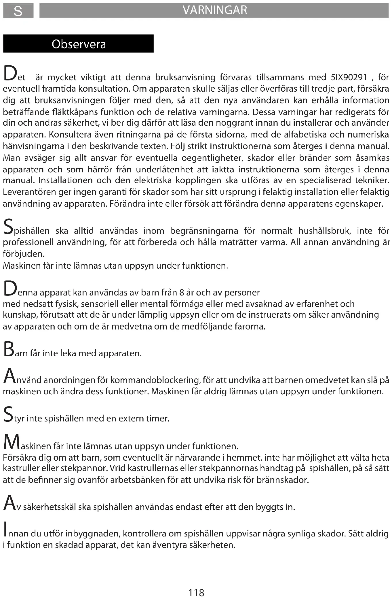 VARNINGAR Observera Det är mycket viktigt att denna bruksanvisning förvaras tillsammans med 5IX90291 , för eventuell framtida konsultation. Om apparaten skulle säljas eller överföras till tredje part, försäkra dig att bruksanvisningen följer med den, så att den nya användaren kan erhålla information beträande äktkåpans funktion och de relativa varningarna. Dessa varningar har redigerats för din och andras säkerhet, vi ber dig därför att läsa den noggrant innan du installerar och använder apparaten. Konsultera även ritningarna på de första sidorna, med de alfabetiska och numeriska hänvisningarna i den beskrivande texten. Följ strikt instruktionerna som återges i denna manual. Man avsäger sig allt ansvar för eventuella oegentligheter, skador eller bränder som åsamkas apparaten och som härrör från underlåtenhet att iaktta instruktionerna som återges i denna manual. Installationen och den elektriska kopplingen ska utföras av en specialiserad tekniker. Leverantören ger ingen garanti för skador som har sitt ursprung i felaktig installation eller felaktig användning av apparaten. Förändra inte eller försök att förändra denna apparatens egenskaper. Spishällen ska alltid användas inom begränsningarna för normalt hushållsbruk, inte för professionell användning, för att förbereda och hålla maträtter varma. All annan användning är förbjuden. Maskinen får inte lämnas utan uppsyn under funktionen. Denna apparat kan användas av barn från 8 år och av personer med nedsatt fysisk, sensoriell eller mental förmåga eller med avsaknad av erfarenhet och kunskap, förutsatt att de är under lämplig uppsyn eller om de instruerats om säker användning av apparaten och om de är medvetna om de medföljande farorna. Barn får inte leka med apparaten. Använd anordningen för kommandoblockering, för att undvika att barnen omedvetet kan slå på maskinen och ändra dess funktioner. Maskinen får aldrig lämnas utan uppsyn under funktionen. Styr inte spishällen med en extern timer. Maskinen får inte lämnas utan uppsyn under funktionen. Försäkra dig om att barn, som eventuellt är närvarande i hemmet, inte har möjlighet att välta heta kastruller eller stekpannor. Vrid kastrullernas eller stekpannornas handtag på spishällen, på så sätt att de benner sig ovanför arbetsbänken för att undvika risk för brännskador. Av säkerhetsskäl ska spishällen användas endast efter att den byggts in. Innan du utför inbyggnaden, kontrollera om spishällen uppvisar några synliga skador. Sätt aldrig i funktion en skadad apparat, det kan äventyra säkerheten.
