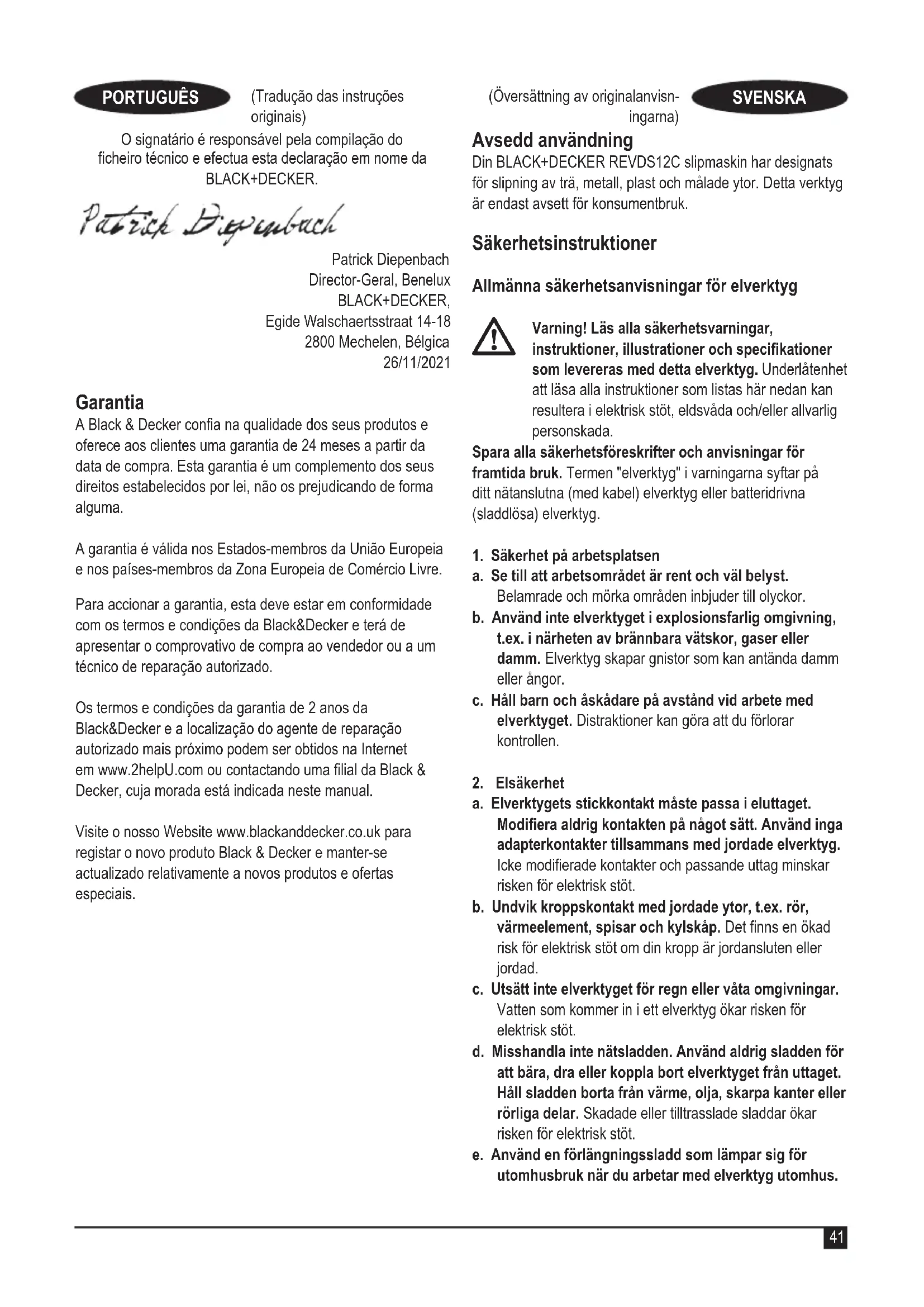 REVDS12C Excenterslipmaskin BLACK+DECKER garanterar att produkterna som beskrivs under ”Tekniska data” uppfyller: 2006/42/EG, EN62841-1:2015, EN62841-2-4:2014. Dessa produkter överensstämmer även med direktiven 2014/30/EU och 2011/65/EU. Mer information får du genom att kontakta BLACK+DECKER på följande adress eller titta i slutet av bruksanvisningen. Undertecknad är ansvarig för sammanställningen av tekniska data och gör denna försäkran för BLACK+DECKER. Patrick Diepenbach General Manager, Benelux BLACK+ DECKER , Egide Walschaertsstraat 14-18 2800 Mechelen, Belgien 2021-11-2646 (Översättning av originalanvis- ningarna) SVENSKA (Oversettelse av de opprinnelige instruksjonene) NORSK Garanti Black & Decker är säker på kvaliteten hos denna produkt och erbjuder kunder 24 månaders garanti från inköpsdatumet. Denna garanti är ett tillägg till dina lagstadgade rättigheter och påverkar inte dessa på något sätt. Garantin är giltig i de områden som tillhör medlemsstaterna i Europeiska unionen och det europeiska frihandelsområdet. För yrkande under garantin måste yrkandet vara in enlighet med Black&Deckers villkor och du kommer att behöva skicka in bevis på köpet till försäljaren eller en auktoriserad reparatör. Villkoren för Black&Deckers tvååriga garanti och var du hittar din närmaste auktoriserade reparatör kan erhållas på internet på www.2helpU.com, eller genom att kontakta ditt lokal Black & Decker kontor på adressen som angetts i denna bruksanvisning. Besök vår webbplats www.blackanddecker.se för att registrera din nya Black & Decker-produkt samt för att få information om nya produkter och specialerbjudanden. (Oversettelse av de opprinnelige instruksjonene) NORSK Tiltenkt bruk Din BLACK+DECKER REVDS12C sandsliper er konstruert for sliping av treverk, metall, plast og malte overater. Dette verktøyet er bare ment som et forbrukerverktøy. Sikkerhetsanvisninger Generelle sikkerhetsadvarsler for elektroverktøy