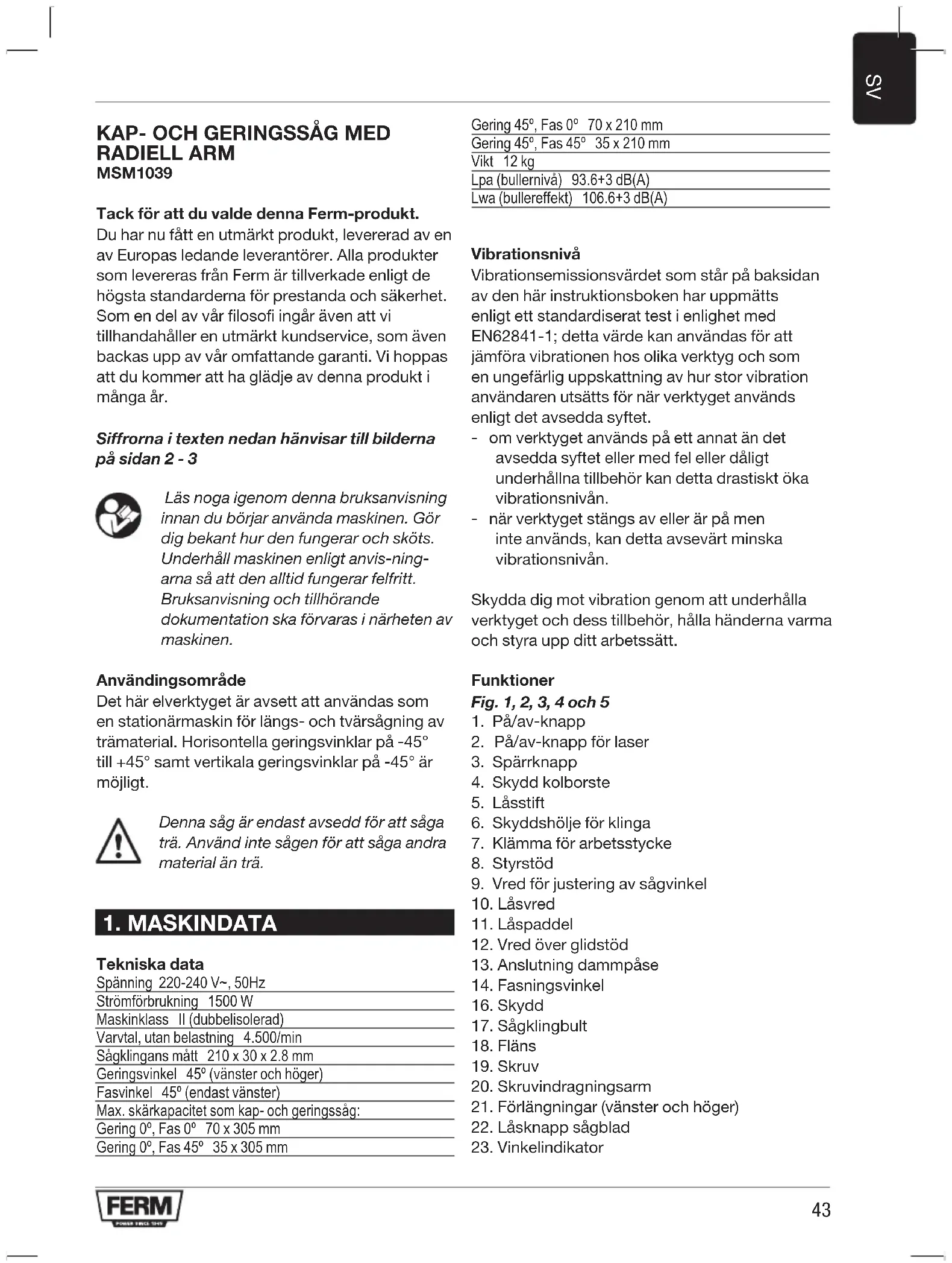 RADIELL ARM MSM1039 Tack för att du valde denna Ferm-produkt. Du har nu fått en utmärkt produkt, levererad av en av Europas ledande leverantörer. Alla produkter som levereras från Ferm är tillverkade enligt de högsta standarderna för prestanda och säkerhet. Som en del av vår filosofi ingår även att vi tillhandahåller en utmärkt kundservice, som även backas upp av vår omfattande garanti. Vi hoppas att du kommer att ha glädje av denna produkt i många år. Siffrorna i texten nedan hänvisar till bilderna på sidan 2 - 3 Läs noga igenom denna bruksanvisning innan du börjar använda maskinen. Gör dig bekant hur den fungerar och sköts. Underhåll maskinen enligt anvis-ning- arna så att den alltid fungerar felfritt. Bruksanvisning och tillhörande dokumentation ska förvaras i närheten av maskinen. Användingsområde Det här elverktyget är avsett att användas som en stationärmaskin för längs- och tvärsågning av trämaterial. Horisontella geringsvinklar på -45° till +45° samt vertikala geringsvinklar på -45° är möjligt. Denna såg är endast avsedd för att såga trä. Använd inte sågen för att såga andra material än trä.