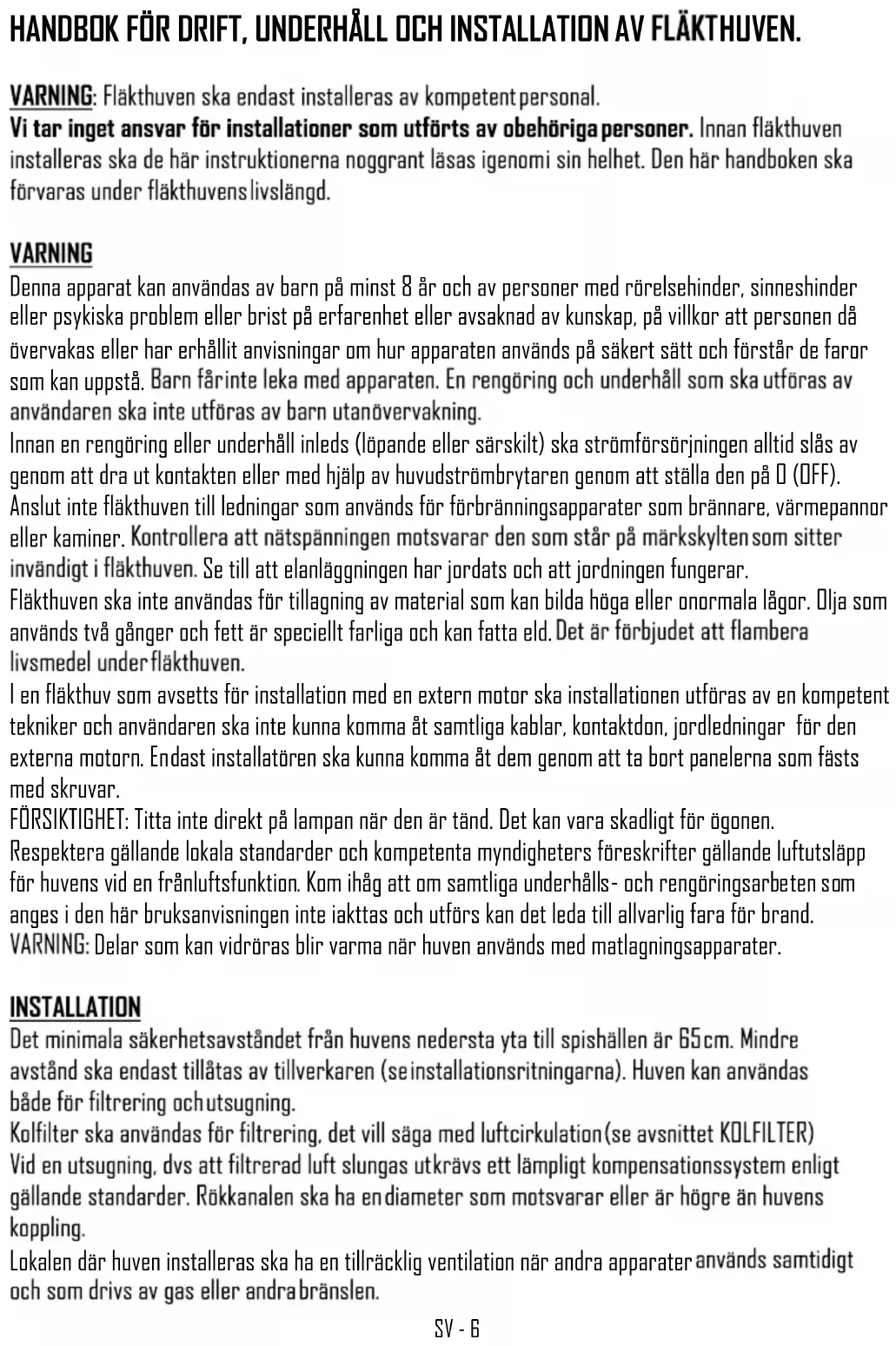 Denna apparat kan användas av barn på minst 8 år och av personer med rörelsehinder, sinneshinder eller psykiska problem eller brist på erfarenhet eller avsaknad av kunskap, på villkor att personen då övervakas eller har erhållit anvisningar om hur apparaten används på säkert sätt och förstår de faror som kan uppstå. Innan en rengöring eller underhåll inleds (löpande eller särskilt) ska strömförsörjningen alltid slås av genom att dra ut kontakten eller med hjälp av huvudströmbrytaren genom att ställa den på 0 (OFF). Anslut inte fläkthuven till ledningar som används för förbränningsapparater som brännare, värmepannor eller kaminer. Se till att elanläggningen har jordats och att jordningen fungerar. Fläkthuven ska inte användas för tillagning av material som kan bilda höga eller onormala lågor. Olja som används två gånger och fett är speciellt farliga och kan fatta eld. I en fläkthuv som avsetts för installation med en extern motor ska installationen utföras av en kompetent tekniker och användaren ska inte kunna komma åt samtliga kablar, kontaktdon, jordledningar för den externa motorn. Endast installatören ska kunna komma åt dem genom att ta bort panelerna som fästs med skruvar. FÖRSIKTIGHET: Titta inte direkt på lampan när den är tänd. Det kan vara skadligt för ögonen. Respektera gällande lokala standarder och kompetenta myndigheters föreskrifter gällande luftutsläpp för huvens vid en frånluftsfunktion. Kom ihåg att om samtliga underhålls- och rengöringsarbeten som anges i den här bruksanvisningen inte iakttas och utförs kan det leda till allvarlig fara för brand. Delar som kan vidröras blir varma när huven används med matlagningsapparater.