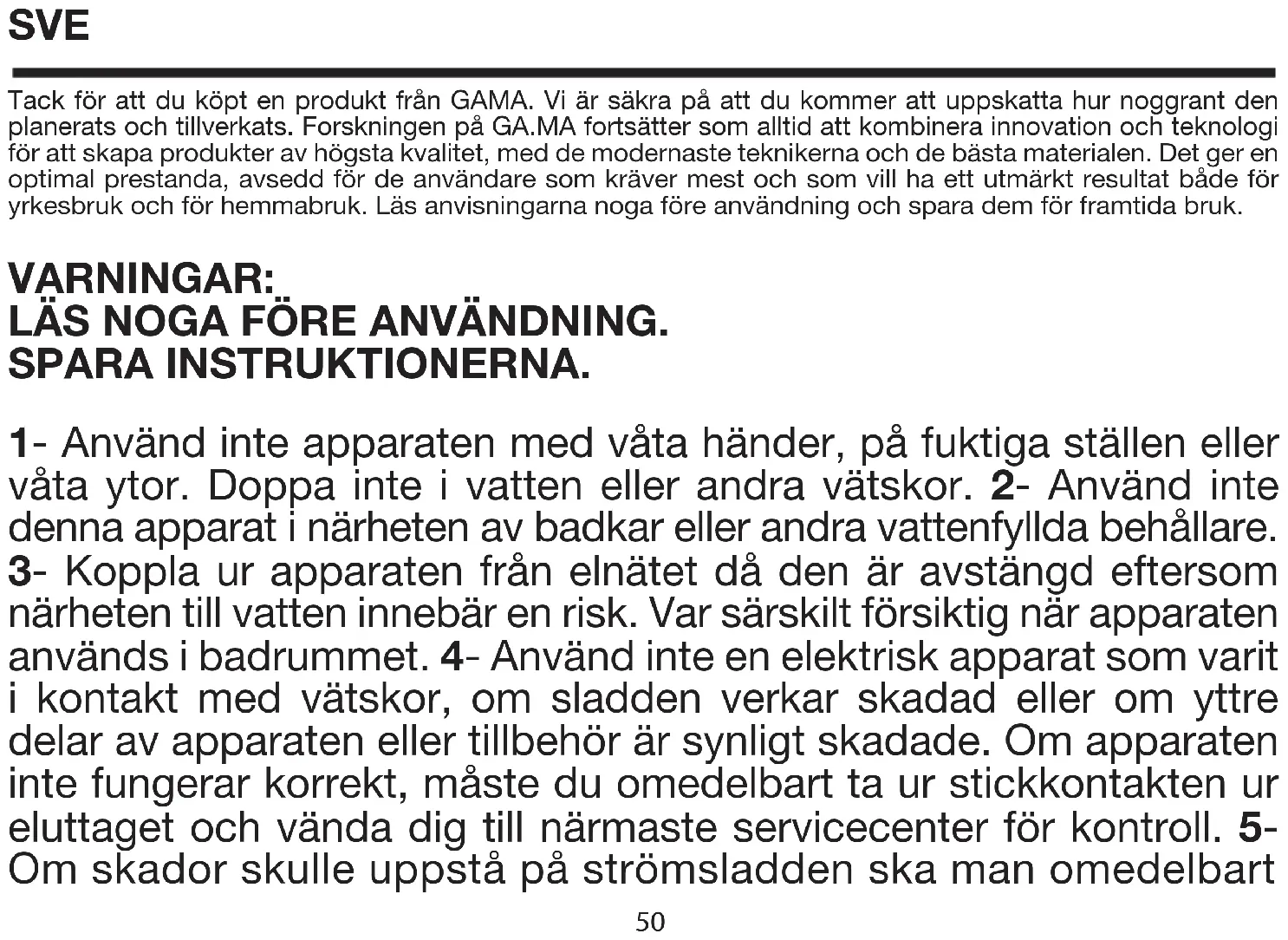 - Put the appliance back in its box. SVE Tack för att du köpt en produkt från GAMA. Vi är säkra på att du kommer att uppskatta hur noggrant den planerats och tillverkats. Forskningen på GA.MA fortsätter som alltid att kombinera innovation och teknologi för att skapa produkter av högsta kvalitet, med de modernaste teknikerna och de bästa materialen. Det ger en optimal prestanda, avsedd för de användare som kräver mest och som vill ha ett utmärkt resultat både för yrkesbruk och för hemmabruk. Läs anvisningarna noga före användning och spara dem för framtida bruk. VARNINGAR: LÄS NOGA FÖRE ANVÄNDNING. SPARA INSTRUKTIONERNA.