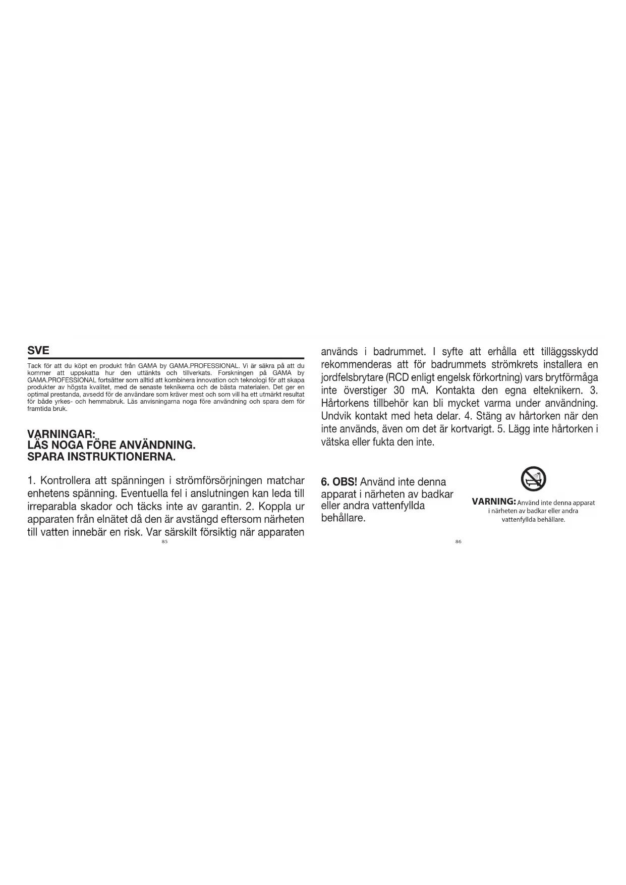 enhetens spänning. Eventuella fel i anslutningen kan leda till irreparabla skador och täcks inte av garantin. 2. Koppla ur apparaten från elnätet då den är avstängd eftersom närheten till vatten innebär en risk. Var särskilt försiktig när apparaten används i badrummet. I syfte att erhålla ett tilläggsskydd rekommenderas att för badrummets strömkrets installera en jordfelsbrytare (RCD enligt engelsk förkortning) vars brytförmåga inte överstiger 30 mA. Kontakta den egna elteknikern. 3. Hårtorkens tillbehör kan bli mycket varma under användning. Undvik kontakt med heta delar. 4. Stäng av hårtorken när den inte används, även om det är kortvarigt. 5. Lägg inte hårtorken i vätska eller fukta den inte.