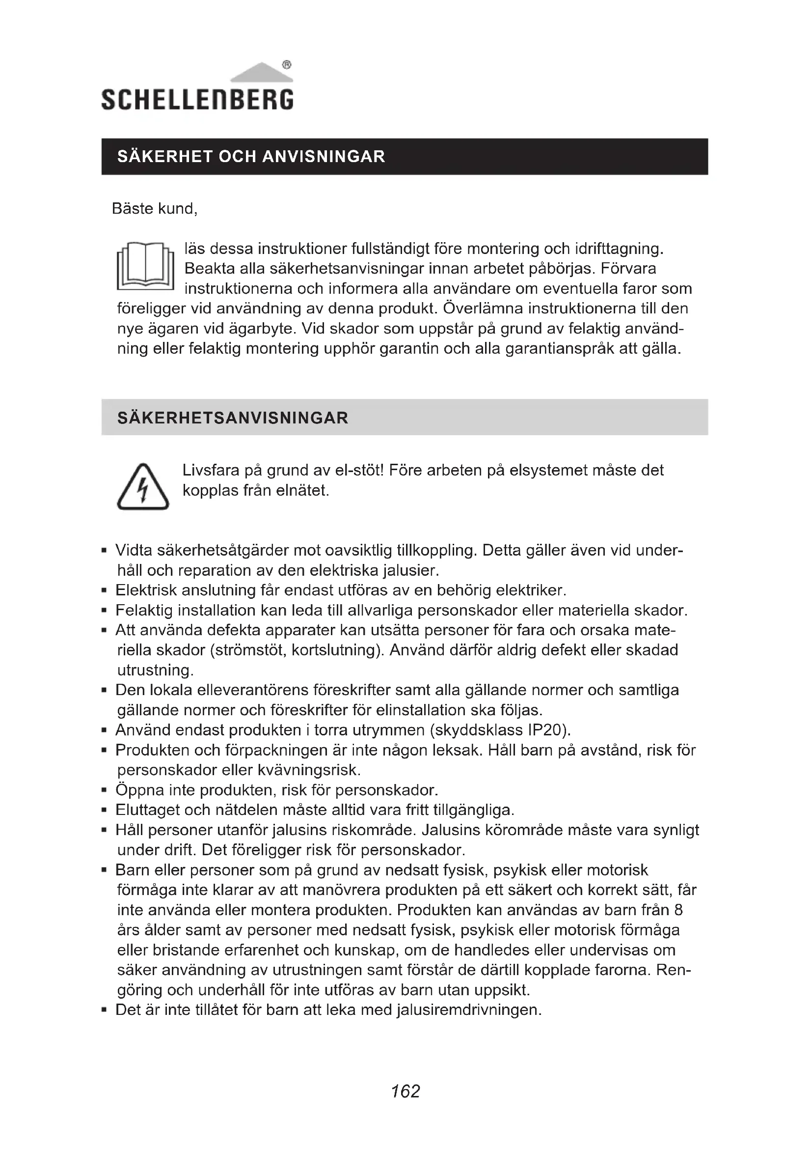 Bäste kund, läs dessa instruktioner fullständigt före montering och idrifttagning Beakta alla säkerhetsanvisningar innan arbetet påbörjas. Förvara instruktionerna och informera alla användare om eventuella faror som föreligger vid användning av denna produkt Överlämna instruktionerna till den nye ägaren vid ägarbyte Vid skador som uppstår på grund av felaktig använd- ning eller felaktig montering upphör garantin och alla garantianspråk att gälla SÄKERHETSANVISNINGAR Livsfara på grund av el-stöt! Före arbeten på elsystemet måste det kopplas från elnätet Vidta säkerhetsåtgärder mot oavsiktlig tillkoppling Detta gäller även vid under- håll och reparation av den elektriska jalusier. Elektrisk anslutning får endast utföras av en behörig elektriker Felaktig installation kan leda till allvarliga personskador eller materiella skador Att använda defekta apparater kan utsätta personer för fara och orsaka mate- riella skador (strömstöt, kortslutning). Använd därför aldrig defekt eller skadad utrustning Den lokala elleverantörens föreskrifter samt alla gällande normer och samtliga gällande normer och föreskrifter för elinstallation ska följas. Använd endast produkten i torra utrymmen (skyddsklass IP20). Produkten och förpackningen är inte någon leksak. Håll barn på avstånd, risk för personskador eller kvävningsrisk Öppna inte produkten, risk för personskador. Eluttaget och nätdelen måste alltid vara fritt tillgängliga Håll personer utanför jalusins riskområde. Jalusins körområde måste vara synligt under drift Det föreligger risk för personskador Barn eller personer som på grund av nedsatt fysisk, psykisk eller motorisk förmåga inte klarar av att manövrera produkten på ett säkert och korrekt sätt, får inte använda eller montera produkten Produkten kan användas av barn från 8 års ålder samt av personer med nedsatt fysisk, psykisk eller motorisk förmåga eller bristande erfarenhet och kunskap, om de handledes eller undervisas om säker användning av utrustningen samt förstår de därtill kopplade farorna. Ren- göring och underhåll för inte utföras av barn utan uppsikt Det är inte tillåtet för barn att leka med jalusiremdrivningen.163162