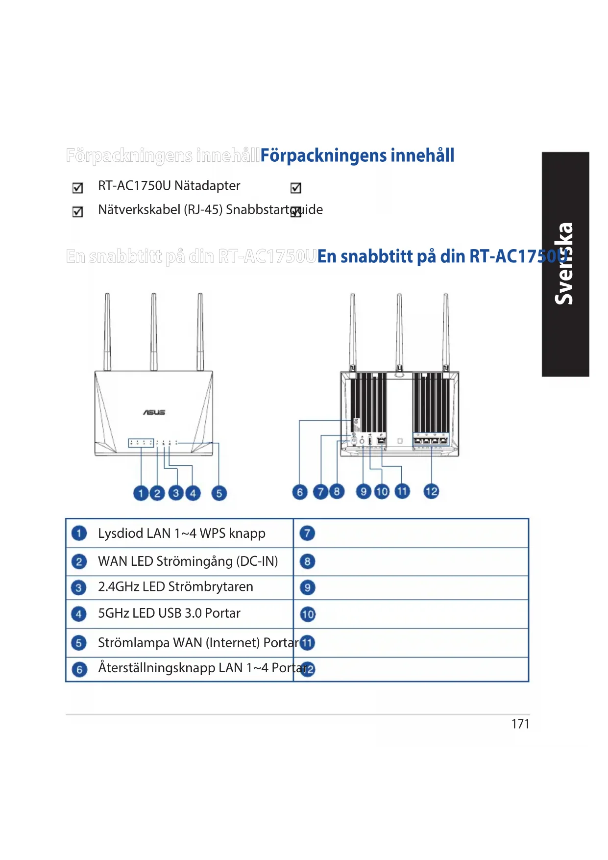 - Uporabniški priročnik lahko dobite na spletni strani https://www.asus.com/support171 Svenska En snabbtitt på din RT-AC1750UEn snabbtitt på din RT-AC1750U Förpackningens innehållFörpackningens innehåll RT-AC1750U Nätadapter Nätverkskabel (RJ-45) Snabbstartguide Lysdiod LAN 1~4 WPS knapp WAN LED Strömingång (DC-IN) 2.4GHz LED Strömbrytaren 5GHz LED USB 3.0 Portar Strömlampa WAN (Internet) Portar Återställningsknapp LAN 1~4 Portar172 Svenska Placera din routerPlacera din router För bästa trådlösa signalsändning mellan den trådlösa routern och nätverksen- heterna som är anslutna till den, se till att du: