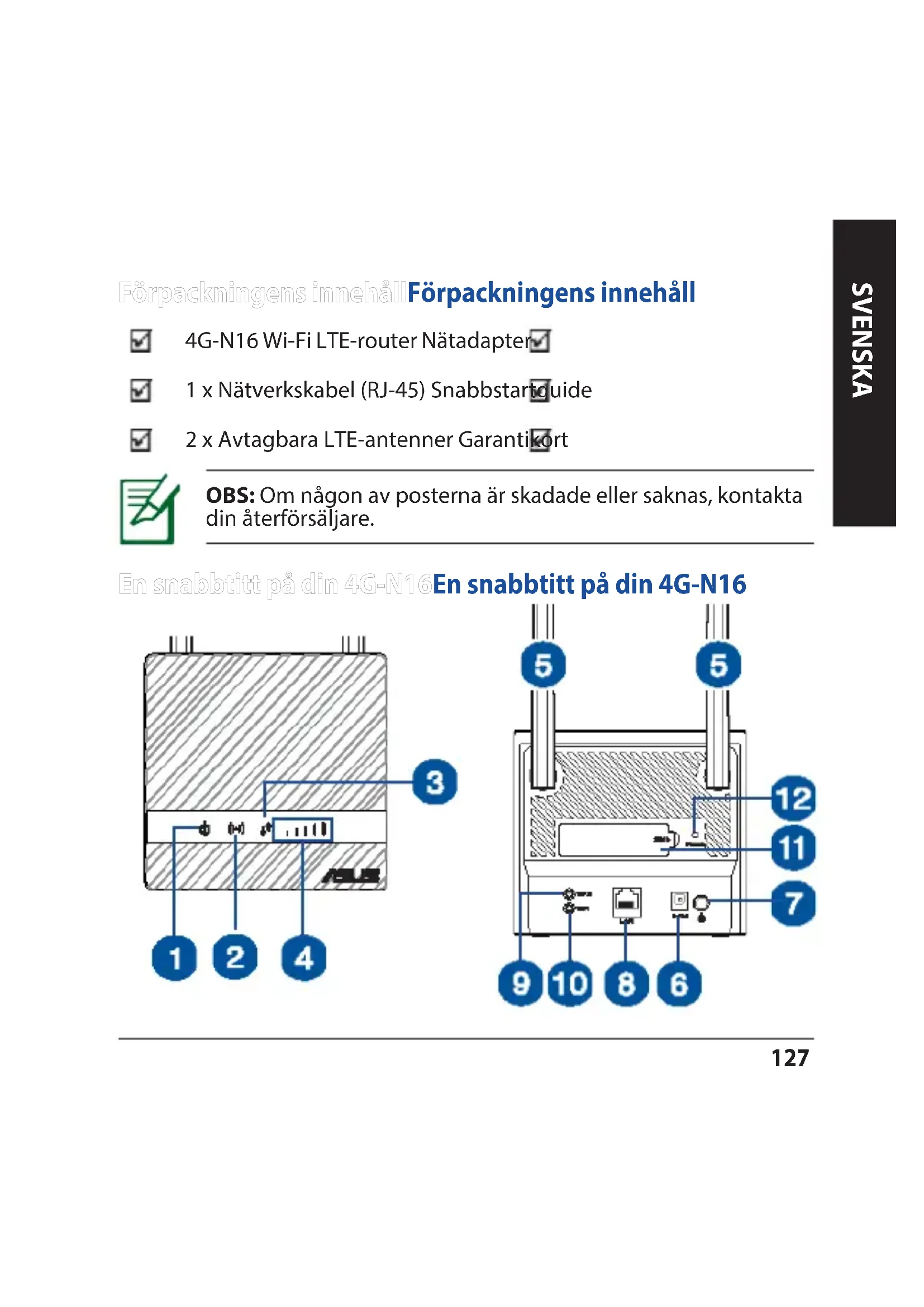 Delovna vlažnost ≤ 90% Shramba ≤ 95%127 SVENSKA OBS: Om någon av posterna är skadade eller saknas, kontakta din återförsäljare. Förpackningens innehållFörpackningens innehåll 4G-N16 Wi-Fi LTE-router Nätadapter 1 x Nätverkskabel (RJ-45) Snabbstartguide 2 x Avtagbara LTE-antenner Garantikort En snabbtitt på din 4G-N16En snabbtitt på din 4G-N16 Svenska128 SVENSKA Installera din routerInstallera din router