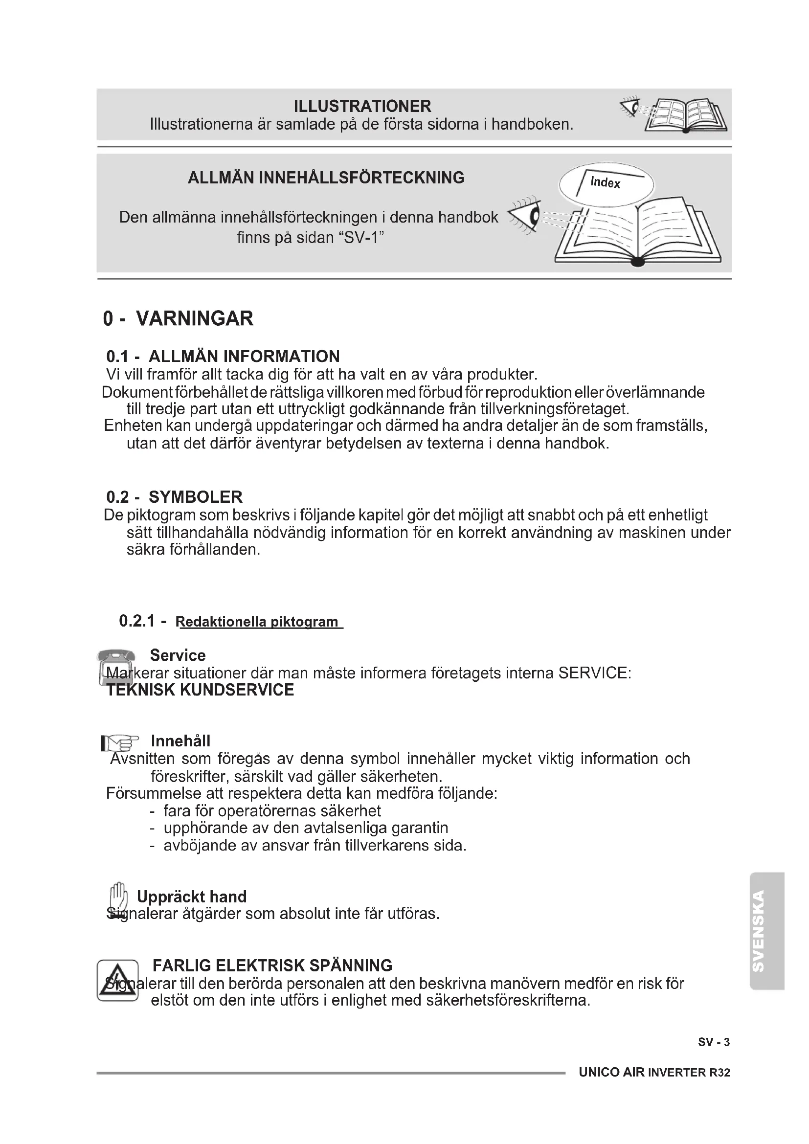 Service Markerar situationer där man måste informera företagets interna SERVICE: TEKNISK KUNDSERVICE Innehåll Avsnitten som föregås av denna symbol innehåller mycket viktig information och föreskrifter, särskilt vad gäller säkerheten. Försummelse att respektera detta kan medföra följande: - fara för operatörernas säkerhet - upphörande av den avtalsenliga garantin - avböjande av ansvar från tillverkarens sida. Uppräckt hand Signalerar åtgärder som absolut inte får utföras.