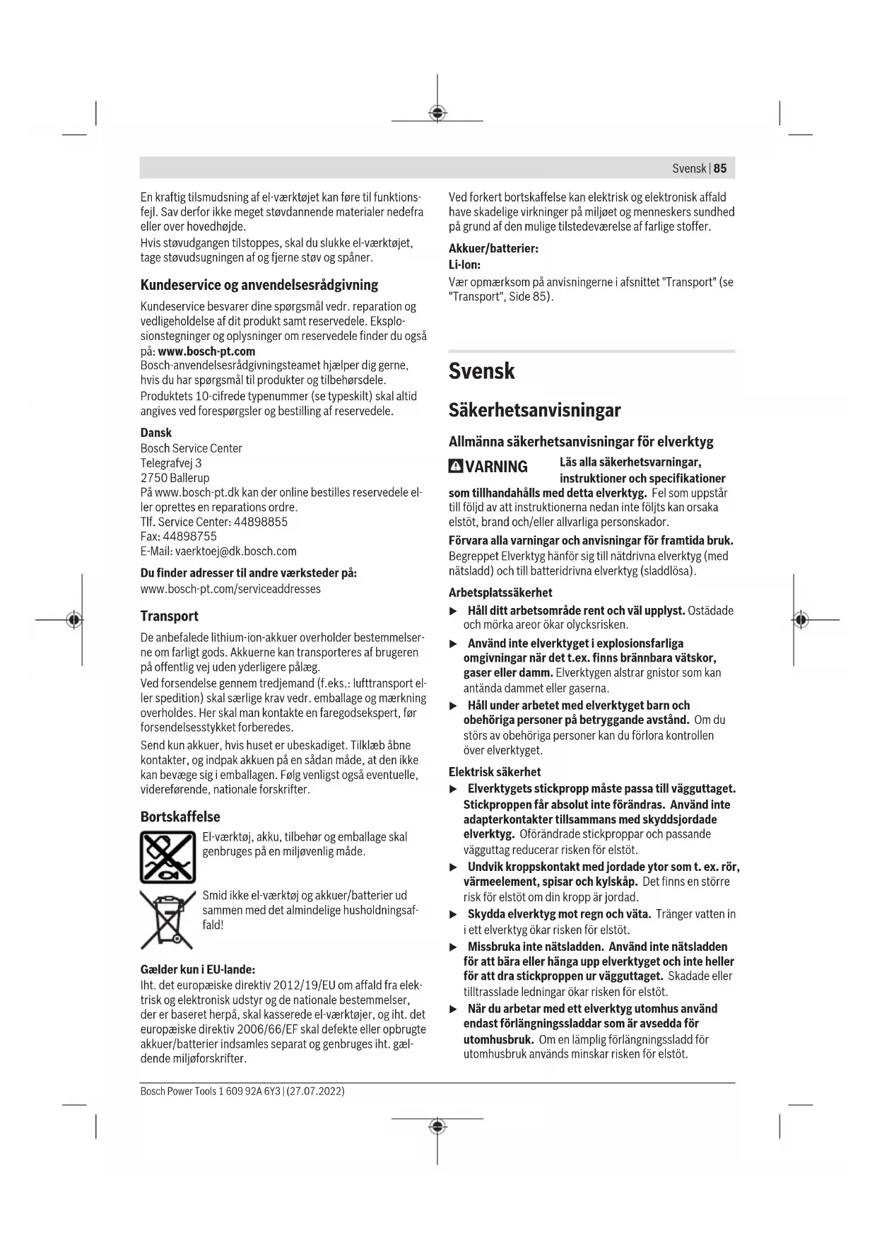 Low Energy Module sender et sig- nal med jævne mellemrum. Afhængigt af omgivelserne kan der være behov for flere sendeintervaller, før el-værktøjet genkendes. Hvis el-værktøjet ikke genkendes, skal du kon- trollere følgende: – Er afstanden til mobilenheden for stor? Reducer afstanden mellem mobilenheden og el-værktø- jet. – Sluk Bluetooth® på mobilenheden, og tænd igen. Kontrollér, om el-værktøjet genkendes nu. Funktioner i forbindelse med el-værktøjet I forbindelse med Bluetooth® Low Energy Module kan du be- nytte følgende Connectivity-funktioner til el-værktøjet: – Registrering og personlig tilpasning – Statuskontrol, udlæsning af advarselsmeddelelser – Generelle oplysninger og indstillinger – Administration – Programmering af slagtalstrin – Tænd/sluk og styring af ASC (GST18V‑155SC) – Advarselsmeddelelser (temperaturafhængig overbelast- ningsbeskyttelse, kollisionsfrakobling) Vedligeholdelse og service Vedligeholdelse og rengøring u Tag altid akkuen ud af el‑værktøjet, før der arbejdes på el‑værktøjet (f.eks. vedligeholdelse, værktøjsskift osv.) samt før det transporteres og lægges til opbeva- ring. Utilsigtet aktivering af start-stop-kontakten er for- bundet med kvæstelsesfare. u El‑værktøj og el‑værktøjets ventilationsåbninger skal altid holdes rene for at sikre et godt og sikkert ar- bejde. Rengør savklingeholderen med regelmæssige mellemrum. Tag savklingen ud af el‑værktøjet og bank el‑værktøjet let på en lige flade. 1 609 92A 6Y3 | (27.07.2022) Bosch Power ToolsSvensk | 85 En kraftig tilsmudsning af el-værktøjet kan føre til funktions- fejl. Sav derfor ikke meget støvdannende materialer nedefra eller over hovedhøjde. Hvis støvudgangen tilstoppes, skal du slukke el-værktøjet, tage støvudsugningen af og fjerne støv og spåner. Kundeservice og anvendelsesrådgivning Kundeservice besvarer dine spørgsmål vedr. reparation og vedligeholdelse af dit produkt samt reservedele. Eksplo- sionstegninger og oplysninger om reservedele finder du også på: www.bosch-pt.com Bosch-anvendelsesrådgivningsteamet hjælper dig gerne, hvis du har spørgsmål til produkter og tilbehørsdele. Produktets 10‑cifrede typenummer (se typeskilt) skal altid angives ved forespørgsler og bestilling af reservedele. Dansk Bosch Service Center Telegrafvej 3 2750 Ballerup På www.bosch-pt.dk kan der online bestilles reservedele el- ler oprettes en reparations ordre. Tlf. Service Center: 44898855 Fax: 44898755 E-Mail: vaerktoej@dk.bosch.com Du finder adresser til andre værksteder på: www.bosch-pt.com/serviceaddresses Transport De anbefalede lithium-ion-akkuer overholder bestemmelser- ne om farligt gods. Akkuerne kan transporteres af brugeren på offentlig vej uden yderligere pålæg. Ved forsendelse gennem tredjemand (f.eks.: lufttransport el- ler spedition) skal særlige krav vedr. emballage og mærkning overholdes. Her skal man kontakte en faregodsekspert, før forsendelsesstykket forberedes. Send kun akkuer, hvis huset er ubeskadiget. Tilklæb åbne kontakter, og indpak akkuen på en sådan måde, at den ikke kan bevæge sig i emballagen. Følg venligst også eventuelle, videreførende, nationale forskrifter. Bortskaffelse El-værktøj, akku, tilbehør og emballage skal genbruges på en miljøvenlig måde. Smid ikke el-værktøj og akkuer/batterier ud sammen med det almindelige husholdningsaf- fald! Gælder kun i EU‑lande: Iht. det europæiske direktiv 2012/19/EU om affald fra elek- trisk og elektronisk udstyr og de nationale bestemmelser, der er baseret herpå, skal kasserede el-værktøjer, og iht. det europæiske direktiv 2006/66/EF skal defekte eller opbrugte akkuer/batterier indsamles separat og genbruges iht. gæl- dende miljøforskrifter. Ved forkert bortskaffelse kan elektrisk og elektronisk affald have skadelige virkninger på miljøet og menneskers sundhed på grund af den mulige tilstedeværelse af farlige stoffer. Akkuer/batterier: Li-Ion: Vær opmærksom på anvisningerne i afsnittet "Transport" (se "Transport", Side85). Svensk Säkerhetsanvisningar Allmänna säkerhetsanvisningar för elverktyg VARNING Läs alla säkerhetsvarningar, instruktioner och specifikationer som tillhandahålls med detta elverktyg. Fel som uppstår till följd av att instruktionerna nedan inte följts kan orsaka elstöt, brand och/eller allvarliga personskador. Förvara alla varningar och anvisningar för framtida bruk. Begreppet Elverktyg hänför sig till nätdrivna elverktyg (med nätsladd) och till batteridrivna elverktyg (sladdlösa). Arbetsplatssäkerhet u Håll ditt arbetsområde rent och väl upplyst. Ostädade och mörka areor ökar olycksrisken. u Använd inte elverktyget i explosionsfarliga omgivningar när det t.ex. finns brännbara vätskor, gaser eller damm. Elverktygen alstrar gnistor som kan antända dammet eller gaserna. u Håll under arbetet med elverktyget barn och obehöriga personer på betryggande avstånd. Om du störs av obehöriga personer kan du förlora kontrollen över elverktyget. Elektrisk säkerhet u Elverktygets stickpropp måste passa till vägguttaget. Stickproppen får absolut inte förändras. Använd inte adapterkontakter tillsammans med skyddsjordade elverktyg. Oförändrade stickproppar och passande vägguttag reducerar risken för elstöt. u Undvik kroppskontakt med jordade ytor som t.ex. rör, värmeelement, spisar och kylskåp. Det finns en större risk för elstöt om din kropp är jordad. u Skydda elverktyg mot regn och väta. Tränger vatten in i ett elverktyg ökar risken för elstöt. u Missbruka inte nätsladden. Använd inte nätsladden för att bära eller hänga upp elverktyget och inte heller för att dra stickproppen ur vägguttaget. Skadade eller tilltrasslade ledningar ökar risken för elstöt. u När du arbetar med ett elverktyg utomhus använd endast förlängningssladdar som är avsedda för utomhusbruk. Om en lämplig förlängningssladd för utomhusbruk används minska