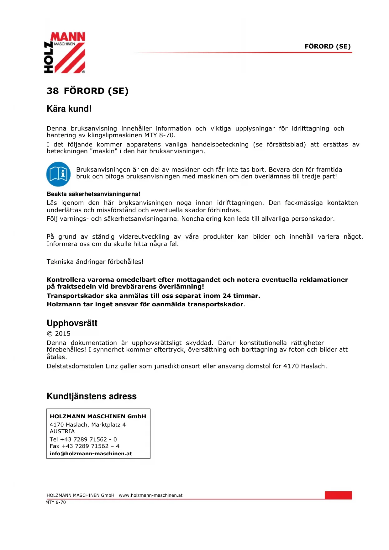 LÄS BRUKSANVISNINGEN Läs noga igenom bruks- och underhållsanvisningen för din maskin och bekanta dig med maskinens kontroller för att maskinen ska fungera korrekt och därmed förebygga skador på människor och maskin.SICHERHEITSZEICHEN / SAFETY SIGNS HOLZMANN MASCHINEN GmbH www.holzmann-maschinen.at 7 MTY 8-70