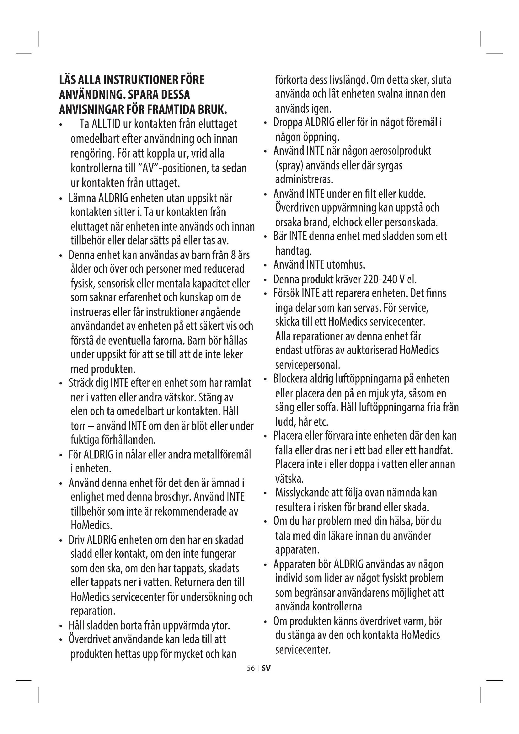 - Om produkten känns överdrivet varm, bör du stänga av den och kontakta HoMedics servicecenter.SV I 57