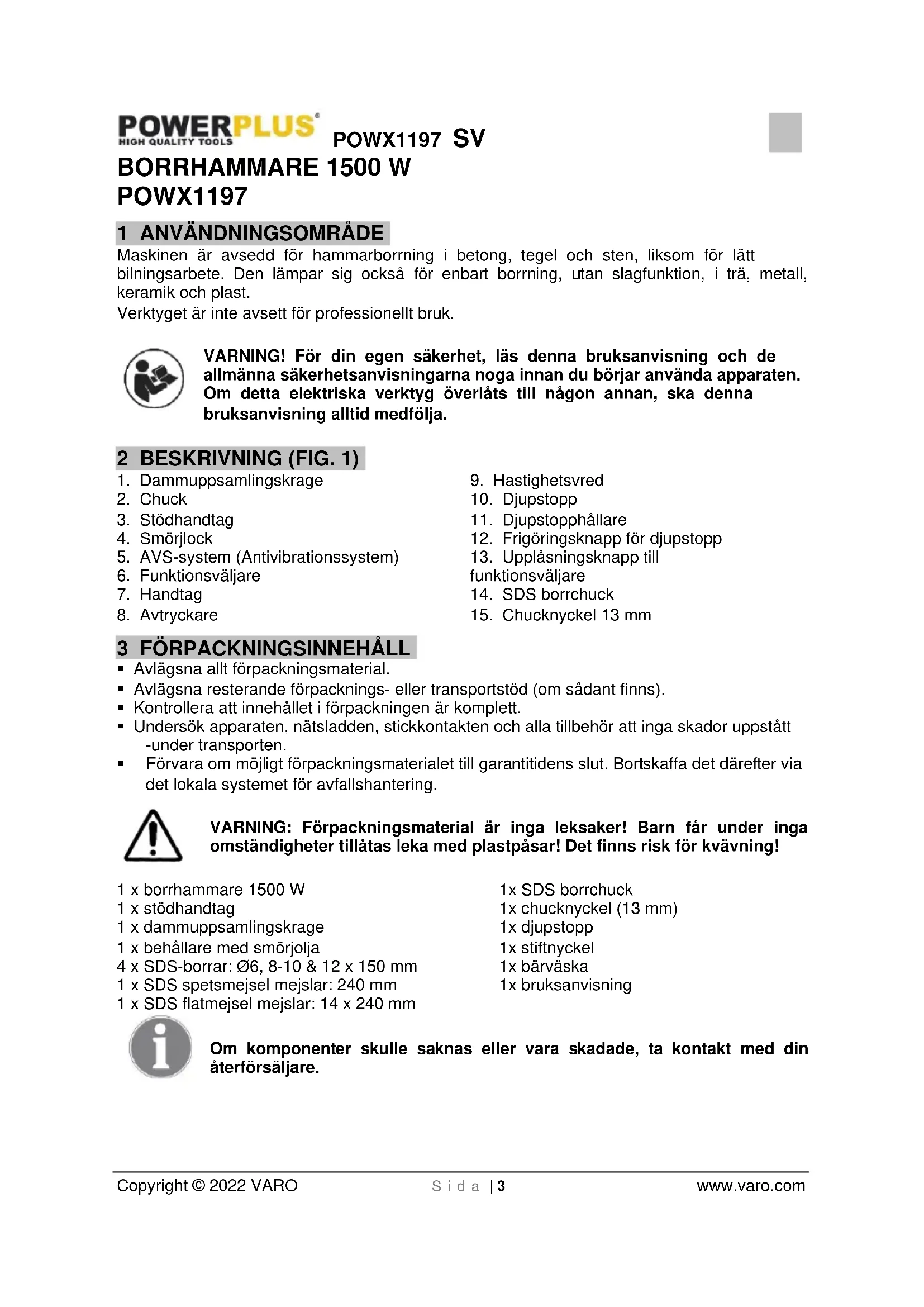 WARNING! For din egen sakerhet, lás denna bra克斯anvising och de allmanna sakerhetsanvisingarna noga innan du börjar anvanda apparaten. Om detta elektriska verktyg überlåts till nagon annan, ska这几个 bra克斯anvising alltid medfolja.