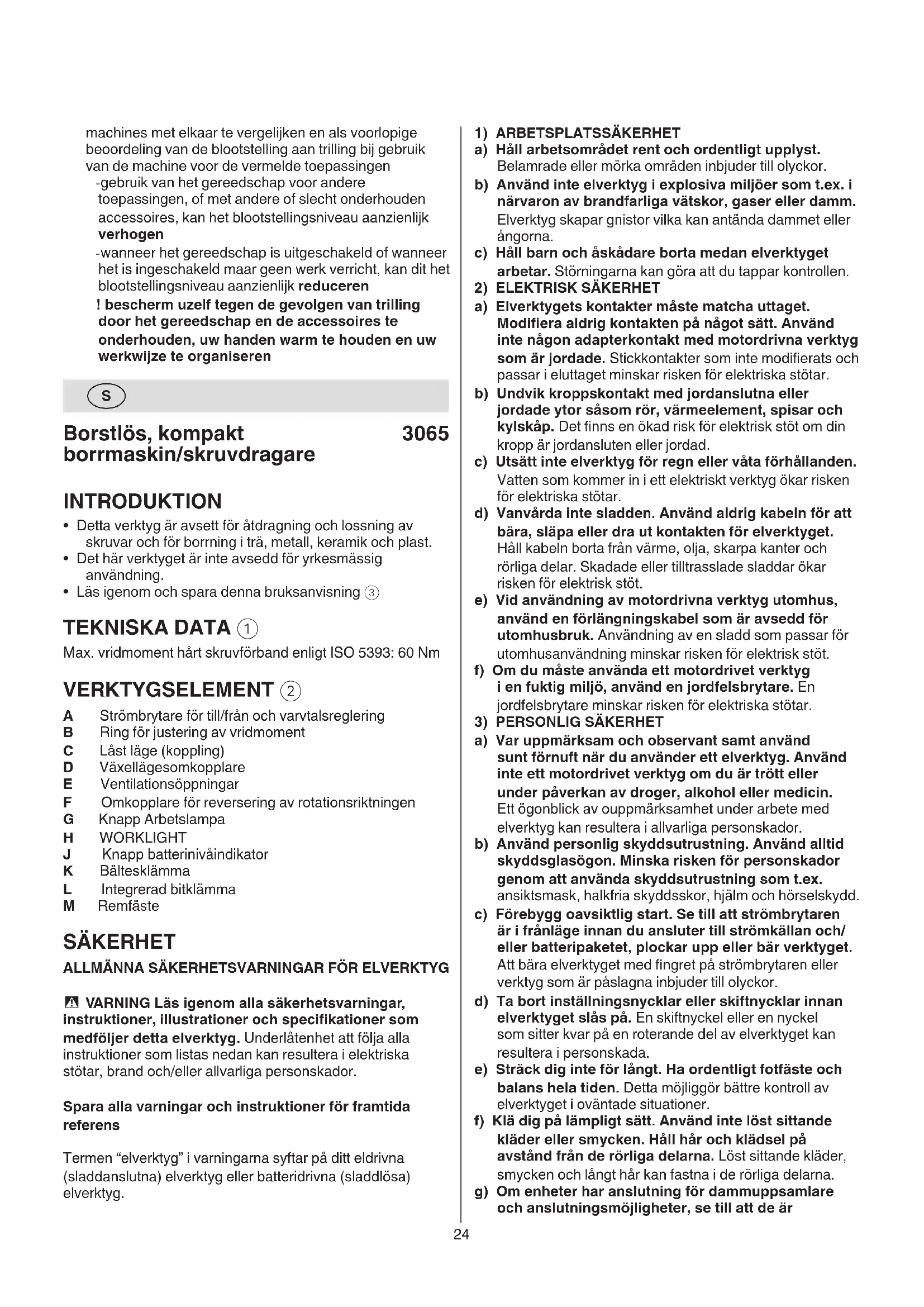 J Knapp batterinivåindikator K Bältesklämma L Integrerad bitklämma M Remfäste SÄKERHET ALLMÄNNA SÄKERHETSVARNINGAR FÖR ELVERKTYG - VARNING Läs igenom alla säkerhetsvarningar, instruktioner, illustrationer och specikationer som medföljer detta elverktyg. Underlåtenhet att följa alla instruktioner som listas nedan kan resultera i elektriska stötar, brand och/eller allvarliga personskador. Spara alla varningar och instruktioner för framtida referens Termen “elverktyg” i varningarna syftar på ditt eldrivna (sladdanslutna) elverktyg eller batteridrivna (sladdlösa) elverktyg.25 med ögonen, sök också läkarhjälp. Vätska som sprutar ur batteriet kan orsaka sveda och brännskador. e) Använd inte ett batteripaket eller verktyg som skadats eller modierats. Skadade eller modierade batterier kan leda till oförutsägbart uppträdande som leder till brand, explosion eller risk för personskador. f) Utsätt inte batteripaketet eller verktyget för eld eller extrema temperaturer. Exponering av eld eller temperaturer över 130 °C kan orsaka explosion. g) Följ alla laddningsinstruktioner och ladda inte batteripaketet eller verktyget utanför det temperaturområde som anges i instruktionerna. Felaktig laddning eller vid temperaturer utanför angivet temperaturområde kan skada batteriet och ökar risken för brand.