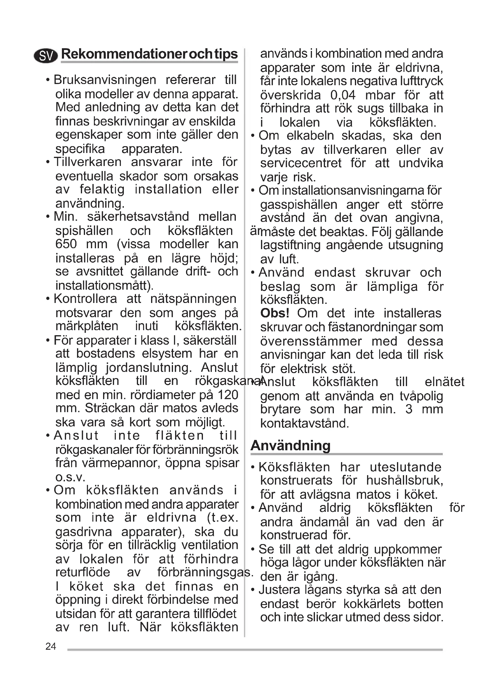 - Köksfläkten har uteslutande konstruerats för hushållsbruk, för att avlägsna matos i köket.