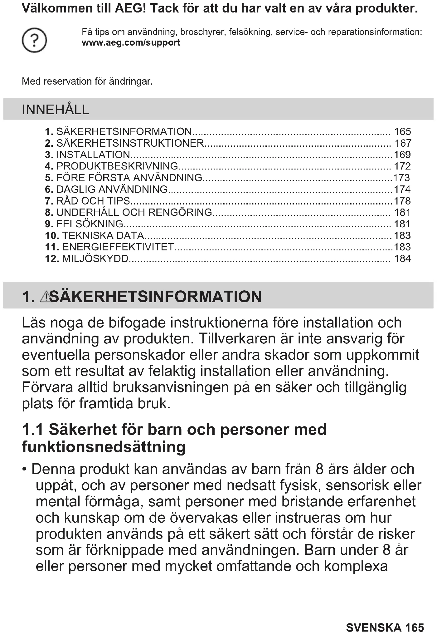 - Denna produkt kan användas av barn från 8 års ålder och uppåt, och av personer med nedsatt fysisk, sensorisk eller mental förmåga, samt personer med bristande erfarenhet och kunskap om de övervakas eller instrueras om hur produkten används på ett säkert sätt och förstår de risker som är förknippade med användningen. Barn under 8 år eller personer med mycket omfattande och komplexa SVENSKA 165funktionsnedsättningar ska inte vistas i närheten av produkten utan ständig uppsikt.