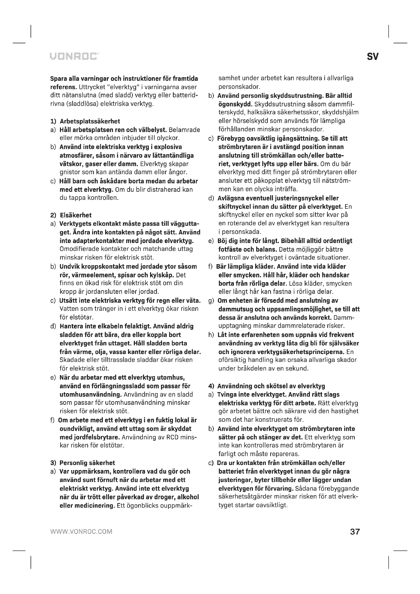Se till att maskinen inte är strömansluten när underhållsarbete utförs på motorn. Rengör maskinens hus regelbundet med en mjuk trasa, helst efter varje gång du använder maskinen. Se till att ventilationsöppningarna är fria från damm och smuts. Ta bort mycket ihållande smuts med en mjuk trasa fuktad med tvållösning. Använd inte lösningsmedel som bensin, alkohol, ammoniak osv. Sådana kemikalier skadar de syntetiska kompo- nenterna. MILJÖ Felaktig och/eller kasserad elektrisk eller elektronisk utrustning måste lämnas in på lämpliga återvinningsstationer. Endast för EU-länder Kassera inte elverktyg ihushållsavfall. Enligt den europeiska riktlinjen 2012/19/EG om kasserad elek- trisk och elektronisk utrustning och dess tillämpning inationell rätt måste elverktyg som inte längre är användbara samlas in separat och kasseras på ett miljövänligt sätt. GARANTI VONROC-produkter är utvecklade enligt högsta kvalitetsstandard och garanteras fria från defekter ibåde material och utförande under den period som lagen föreskriver från och med inköpsdatumet. Om produkten skulle utveckla fel under denna peri- od på grund av defekt material och/eller utförande, kontakta då VONROC direkt. Följande omständigheter är undantagna från denna garanti: