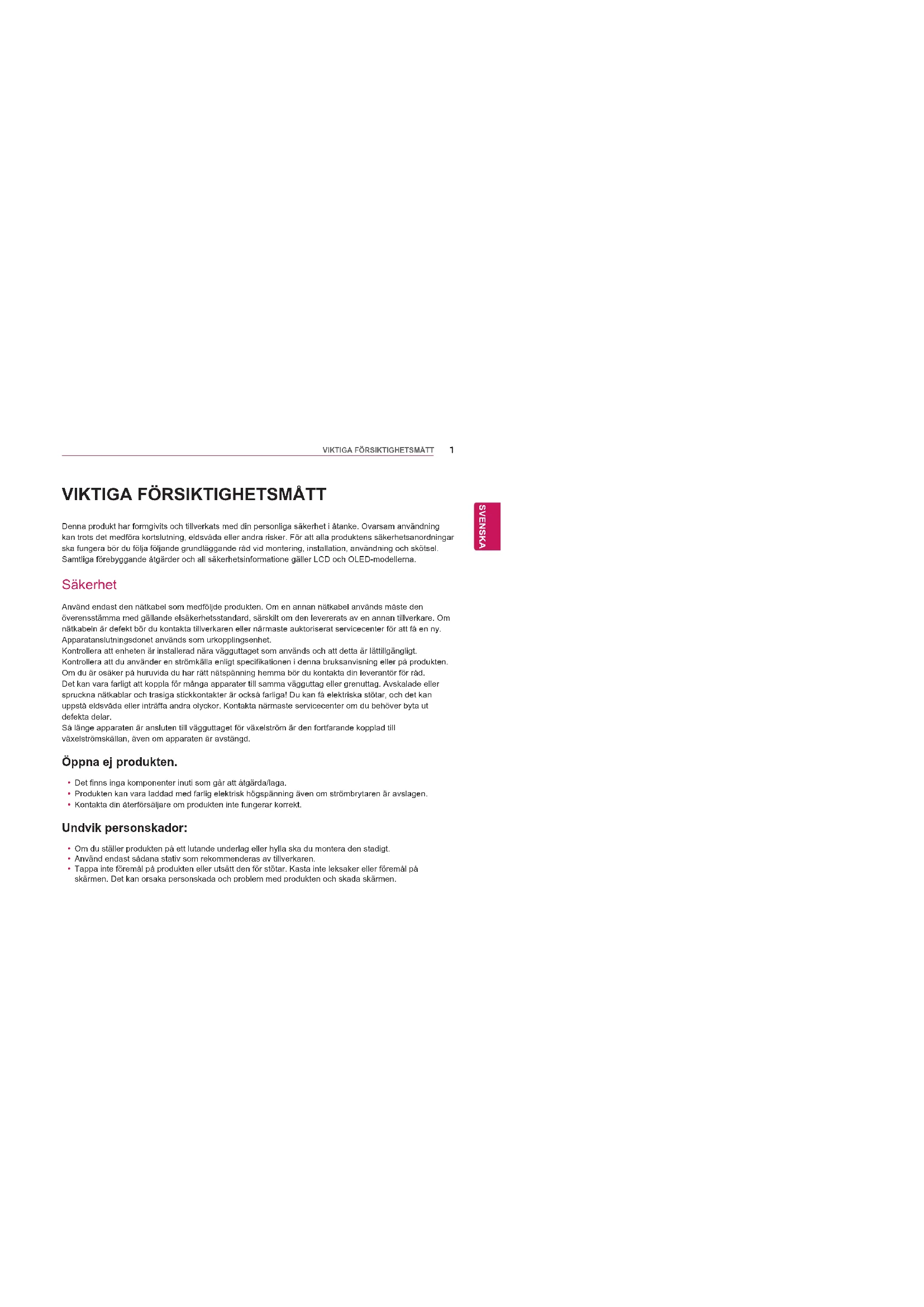 Denna produkt har formgivits och tillverkats med din personliga säkerhet i åtanke. Ovarsam användning kan trots det medföra kortslutning, eldsvåda eller andra risker. För att alla produktens säkerhetsanordningar ska fungera bör du följa följande grundläggande råd vid montering, installation, användning och skötsel.Samtliga förebyggande åtgärder och all säkerhetsinformatione gäller LCD och OLED-modellerna. Säkerhet Använd endast den nätkabel som medföljde produkten. Om en annan nätkabel används måste den överensstämma med gällande elsäkerhetsstandard, särskilt om den levererats av en annan tillverkare. Om nätkabeln är defekt bör du kontakta tillverkaren eller närmaste auktoriserat servicecenter för att få en ny.Apparatanslutningsdonet används som urkopplingsenhet.Kontrollera att enheten är installerad nära vägguttaget som används och att detta är lättillgängligt.Kontrollera att du använder en strömkälla enligt specifikationen i denna bruksanvisning eller på produkten. Om du är osäker på huruvida du har rätt nätspänning hemma bör du kontakta din leverantör för råd.Det kan vara farligt att koppla för många apparater till samma vägguttag eller grenuttag. Avskalade eller spruckna nätkablar och trasiga stickkontakter är också farliga! Du kan få elektriska stötar, och det kan uppstå eldsvåda eller inträffa andra olyckor. Kontakta närmaste servicecenter om du behöver byta ut defekta delar.Så länge apparaten är ansluten till vägguttaget för växelström är den fortfarande kopplad till växelströmskällan, även om apparaten är avstängd. Öppna ej produkten.