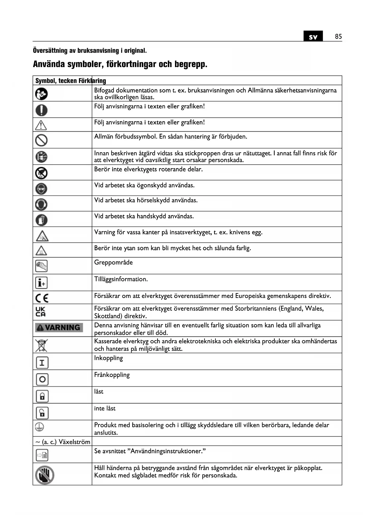 Översättning av bruksanvisning i original. Använda symboler, förkortningar och begrepp. Symbol, tecken Förklaring Bifogad dokumentation som t. ex. bruksanvisningen och Allmänna säkerhetsanvisningarna ska ovillkorligen läsas. Följ anvisningarna i texten eller grafiken! Följ anvisningarna i texten eller grafiken! Allmän förbudssymbol. En sådan hantering är förbjuden. Innan beskriven åtgärd vidtas ska stickproppen dras ur nätuttaget. I annat fall finns risk för att elverktyget vid oavsiktlig start orsakar personskada. Berör inte elverktygets roterande delar. Vid arbetet ska ögonskydd användas. Vid arbetet ska hörselskydd användas. Vid arbetet ska handskydd användas. Varning för vassa kanter på insatsverktyget, t. ex. knivens egg. Berör inte ytan som kan bli mycket het och sålunda farlig. Greppområde Tilläggsinformation. Försäkrar om att elverktyget överensstämmer med Europeiska gemenskapens direktiv. Försäkrar om att elverktyget överensstämmer med Storbritanniens (England, Wales, Skottland) direktiv. Denna anvisning hänvisar till en eventuellt farlig situation som kan leda till allvarliga personskador eller till död. Kasserade elverktyg och andra elektrotekniska och elektriska produkter ska omhändertas och hanteras på miljövänligt sätt. Inkoppling Frånkoppling låst inte låst Produkt med basisolering och i tillägg skyddsledare till vilken berörbara, ledande delar anslutits. ~ (a. c.) Växelström Se avsnittet ”Användningsinstruktioner.” Håll händerna på betryggande avstånd från sågområdet när elverktyget är påkopplat. Kontakt med sågbladet medför risk för personskada.86