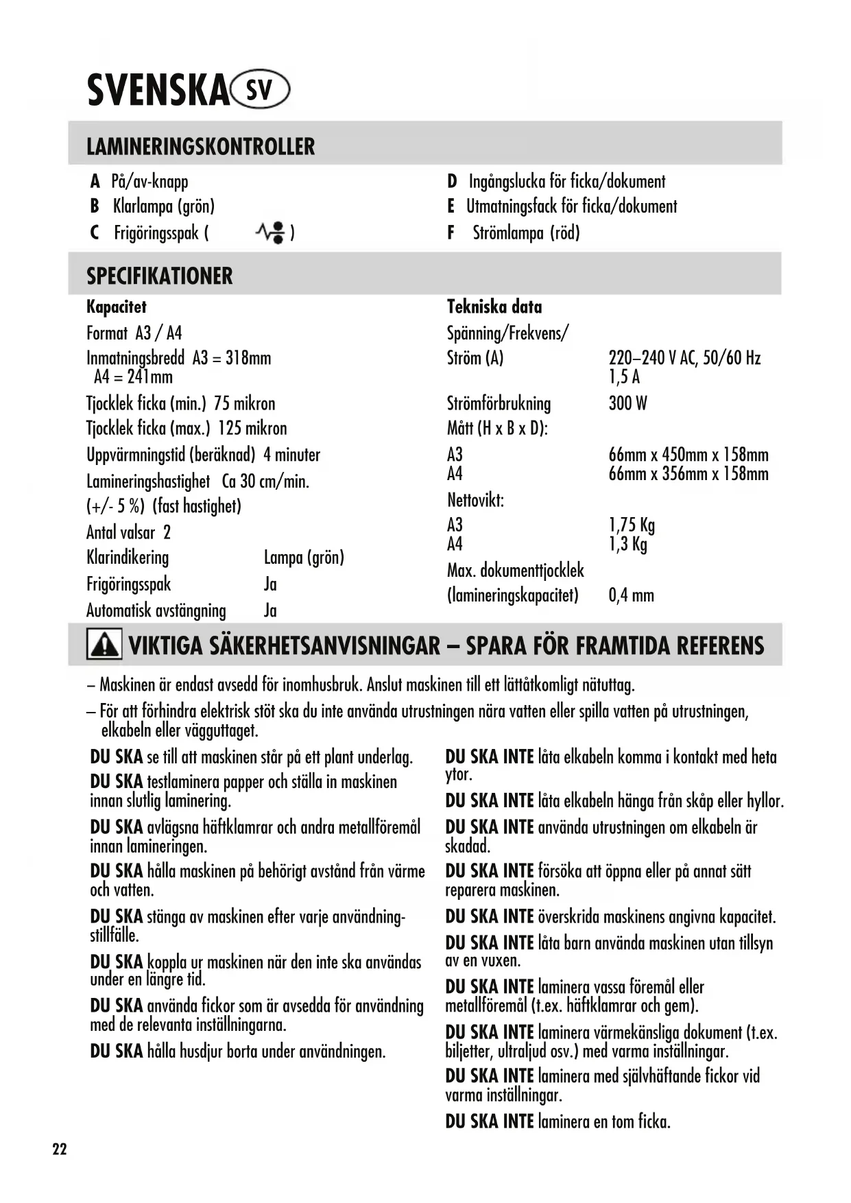 D Ingångslucka för ficka/dokument E Utmatningsfack för ficka/dokument F Strömlampa (röd) SPECIFIKATIONER − Maskinen är endast avsedd för inomhusbruk. Anslut maskinen till ett lättåtkomligt nätuttag. – För att förhindra elektrisk stöt ska du inte använda utrustningen nära vatten eller spilla vatten på utrustningen, elkabeln eller vägguttaget. DU SKA se till att maskinen står på ett plant underlag. DU SKA testlaminera papper och ställa in maskinen innan slutlig laminering. DU SKA avlägsna häftklamrar och andra metallföremål innan lamineringen. DU SKA hålla maskinen på behörigt avstånd från värme och vatten. DU SKA stänga av maskinen efter varje användning- stillfälle. DU SKA koppla ur maskinen när den inte ska användas under en längre tid. DU SKA använda fickor som är avsedda för användning med de relevanta inställningarna. DU SKA hålla husdjur borta under användningen. DU SKA INTE låta elkabeln komma i kontakt med heta ytor. DU SKA INTE låta elkabeln hänga från skåp eller hyllor. DU SKA INTE använda utrustningen om elkabeln är skadad. DU SKA INTE försöka att öppna eller på annat sätt reparera maskinen. DU SKA INTE överskrida maskinens angivna kapacitet. DU SKA INTE låta barn använda maskinen utan tillsyn av en vuxen. DU SKA INTE laminera vassa föremål eller metallföremål (t.ex. häftklamrar och gem). DU SKA INTE laminera värmekänsliga dokument (t.ex. biljetter, ultraljud osv.) med varma inställningar. DU SKA INTE laminera med självhäftande fickor vid varma inställningar. DU SKA INTE laminera en tom ficka. Kapacitet Format A3 / A4 Inmatningsbredd A3 = 318mm A4 = 241mm Tjocklek ficka (min.) 75 mikron Tjocklek ficka (max.) 125 mikron Uppvärmningstid (beräknad) 4 minuter Lamineringshastighet Ca 30cm/min. (+/- 5 %) (fast hastighet) Antal valsar 2 Klarindikering Lampa (grön) Frigöringsspak Ja Automatisk avstängning Ja Tekniska data Spänning/Frekvens/ Ström (A) 220−240 V AC, 50/60 Hz 1,5 A Strömförbrukning 300 W Mått (HxBxD): A3 66mm x 450mm x 158mm A4 66mm x 356mm x 158mm Nettovikt: A3 1,75 Kg A4 1,3 Kg Max. dokumenttjocklek (lamineringskapacitet) 0,4mmFUNKTIONER OCH TIPS FrigöringsfunktionAktivera frigöringsspaken på maskinens baksida om du vill ta bort eller justera en ficka under laminering. Fickan kan bara tas bort från ingångsluckan när spaken har aktiverats.Automatisk avstängning Efter 30 minuter försätts maskinen automa-tiskt i autoavstängningsläge. Strömlampan blinkar rött i fem minuter och släcks sedan. Klarlampan släcks. Tryck på På/av-knappen om du vill fortsätta att använda maskinen. Maskinen återställs.t För bästa resultat bör Fellowes®-märkesfickor använ-das: 80–125 mikron.t Maskinen behöver inte någon carrier för att laminera. Det är en carrier-fri maskin.t Lägg alltid det föremål som ska lamineras i en ficka av rätt storlek.t Provlaminera alltid med en liknande storlek och tjocklek innan den slutliga processen.t Förbered fickan och föremålen för laminering. Placera föremålet mitt i fickan så att det vidrör den första förseglade kanten. Kontrollera att fickan inte är för stor för föremålet.t Om det behövs ska överloppsmaterial kring föremålet putsas bort efter laminering och nedkylning.