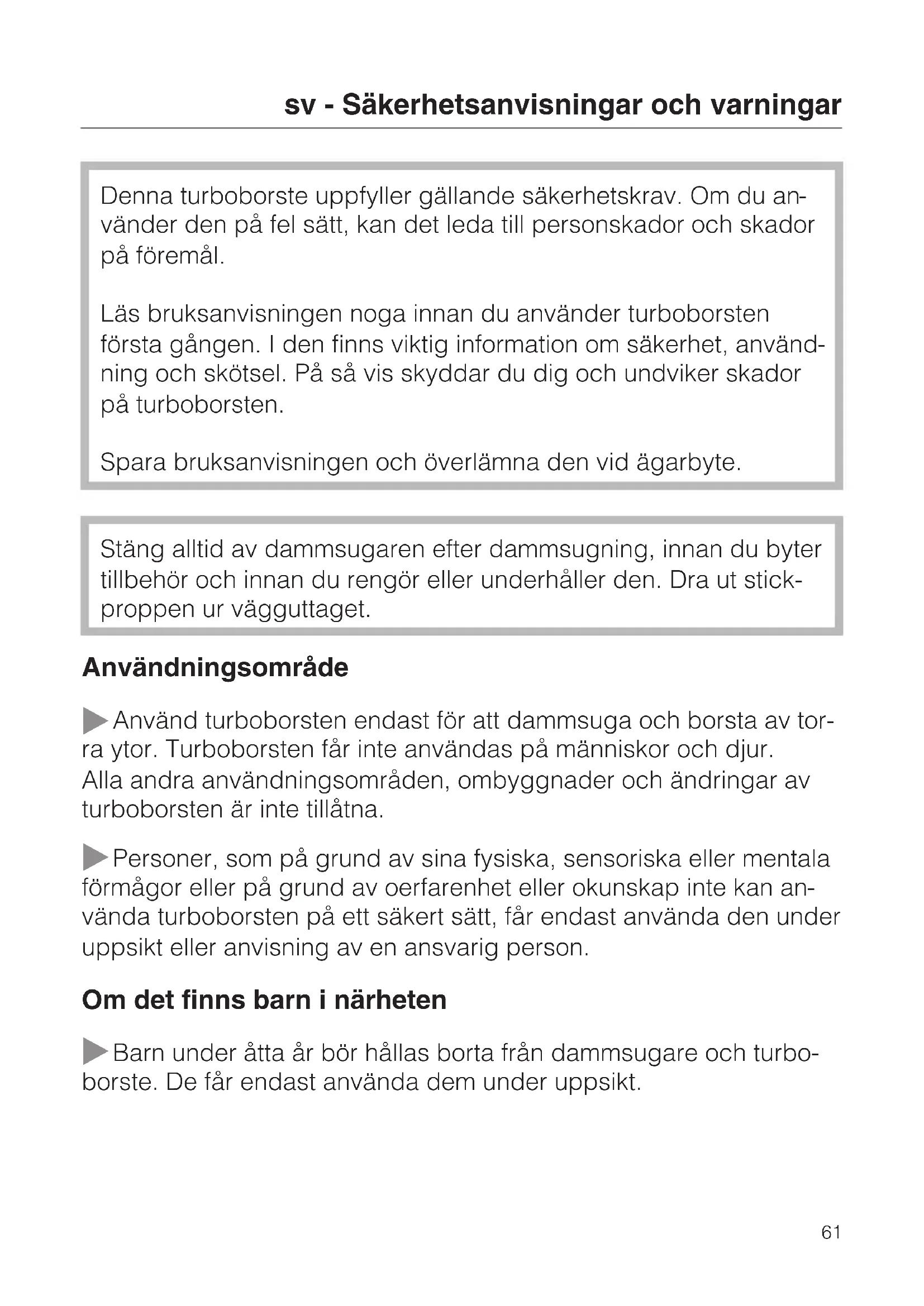 Dammsug inte glödande aska eller kol. Miele ansvarar inte för skador som har uppstått på grund av att turboborsten har använts på annat sätt än den är avsedd för, har använts på ett felaktigt sätt och/eller att säkerhetsanvisningarna och varningarna inte har följts. sv - Säkerhetsanvisningar och varningar 63Turboborstens egenskaper Turboborsten drivs av dammsugarens luftström. Borstvalsens rotation ökar upptaget av trådar, hårstrån och ludd. Fyra hjul håller turboborsten på 1,5 mm avstånd från golvet. Rekommenderad användning Turboborsten är särskilt lämplig för att dammsuga trådar och hårstrån från tex
