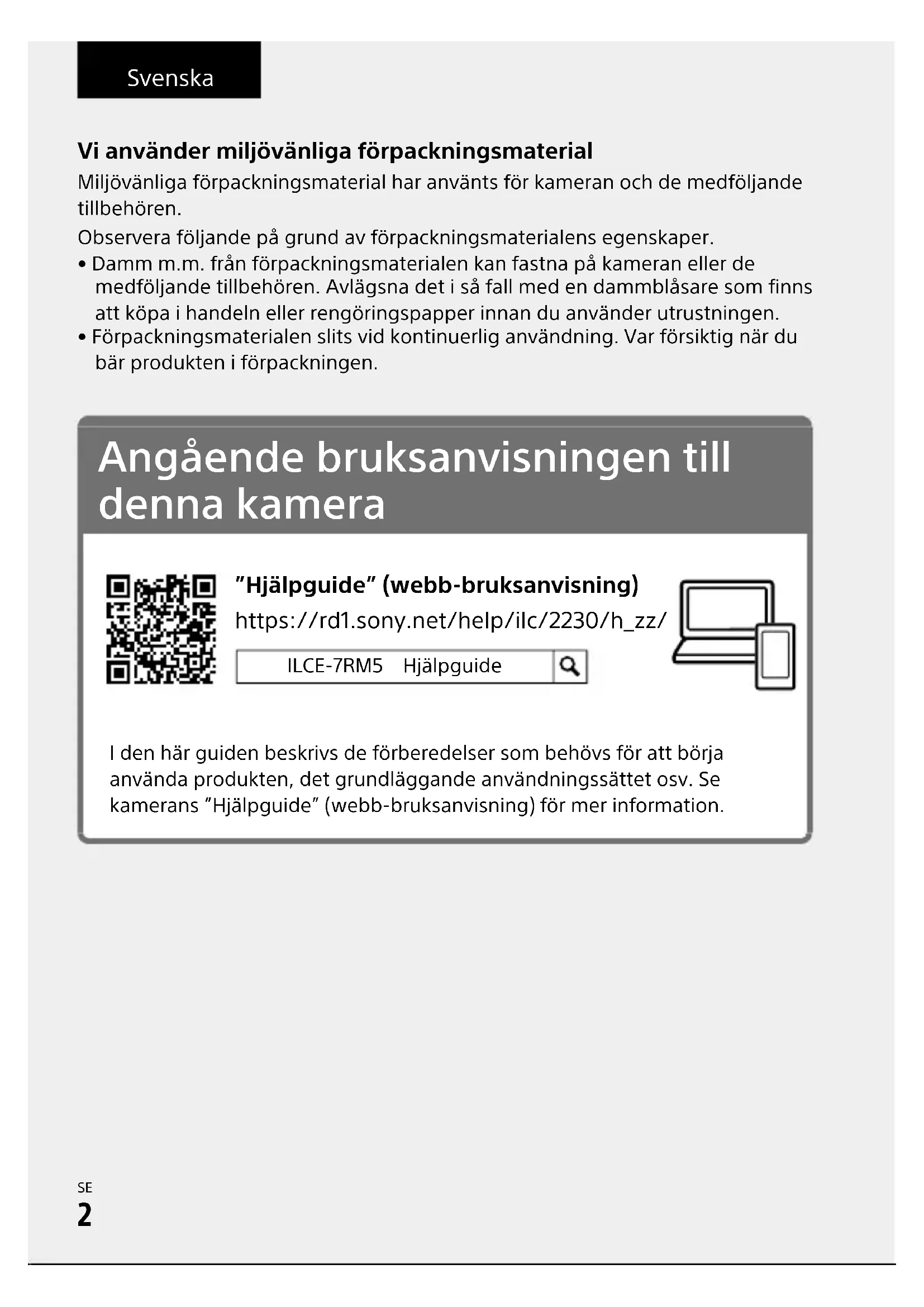 \\win-473\CAMERA\CreatorsApp_SG_kaihan_Hubpage\Multi\2_Compose\2_CX89200(GL)\Printed in Thailand-STT\5043817421_14lang\5043817421ILCE7RM5CEC\11SE-ILCE7RM5CEC\11SE.indd DTP data saved: 2023/04/12 18:52 PDF file created: 2023/04/12 18:53 Svenska Vi använder miljövänliga förpackningsmaterial Miljövänliga förpackningsmaterial har använts för kameran och de medföljande tillbehören.Observera följande på grund av förpackningsmaterialens egenskaper.• Damm m.m. från förpackningsmaterialen kan fastna på kameran eller de medföljande tillbehören. Avlägsna det i så fall med en dammblåsare som finns att köpa i handeln eller rengöringspapper innan du använder utrustningen.• Förpackningsmaterialen slits vid kontinuerlig användning. Var försiktig när du bär produkten i förpackningen. Angående bruksanvisningen till denna kamera https://rd1.sony.net/help/ilc/2230/h_zz/ ”Hjälpguide” (webb-bruksanvisning) ILCE-7RM5 HjälpguideI den här guiden beskrivs de förberedelser som behövs för att börja använda produkten, det grundläggande användningssättet osv. Se kamerans ”Hjälpguide” (webb-bruksanvisning) för mer information.ILCE-7RM55-043-817-42(1)