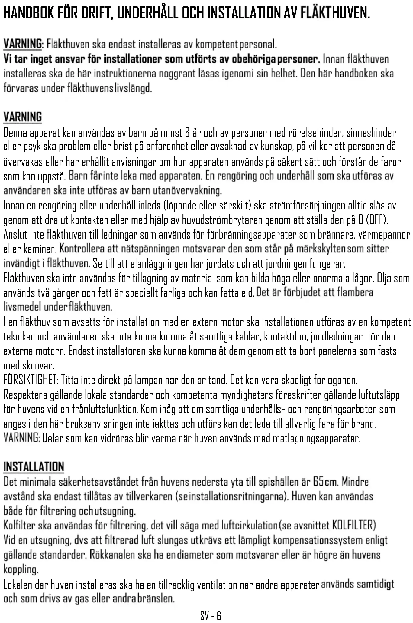 Denna apparat kan användas av barn på minst 8 år och av personer med rörelsehinder, sinneshinder eller psykiska problem eller brist på erfarenhet eller avsaknad av kunskap, på villkor att personen då övervakas eller har erhållit anvisningar om hur apparaten används på säkert sätt och förstår de faror som kan uppstå. Innan en rengöring eller underhåll inleds (löpande eller särskilt) ska strömförsörjningen alltid slås av genom att dra ut kontakten eller med hjälp av huvudströmbrytaren genom att ställa den på 0 (OFF). Anslut inte fläkthuven till ledningar som används för förbränningsapparater som brännare, värmepannor eller kaminer. Se till att elanläggningen har jordats och att jordningen fungerar. Fläkthuven ska inte användas för tillagning av material som kan bilda höga eller onormala lågor. Olja som används två gånger och fett är speciellt farliga och kan fatta eld. I en fläkthuv som avsetts för installation med en extern motor ska installationen utföras av en kompetent tekniker och användaren ska inte kunna komma åt samtliga kablar, kontaktdon, jordledningar för den externa motorn. Endast installatören ska kunna komma åt dem genom att ta bort panelerna som fästs med skruvar. FÖRSIKTIGHET: Titta inte direkt på lampan när den är tänd. Det kan vara skadligt för ögonen. Respektera gällande lokala standarder och kompetenta myndigheters föreskrifter gällande luftutsläpp för huvens vid en frånluftsfunktion. Kom ihåg att om samtliga underhålls- och rengöringsarbeten som anges i den här bruksanvisningen inte iakttas och utförs kan det leda till allvarlig fara för brand. Delar som kan vidröras blir varma när huven används med matlagningsapparater.