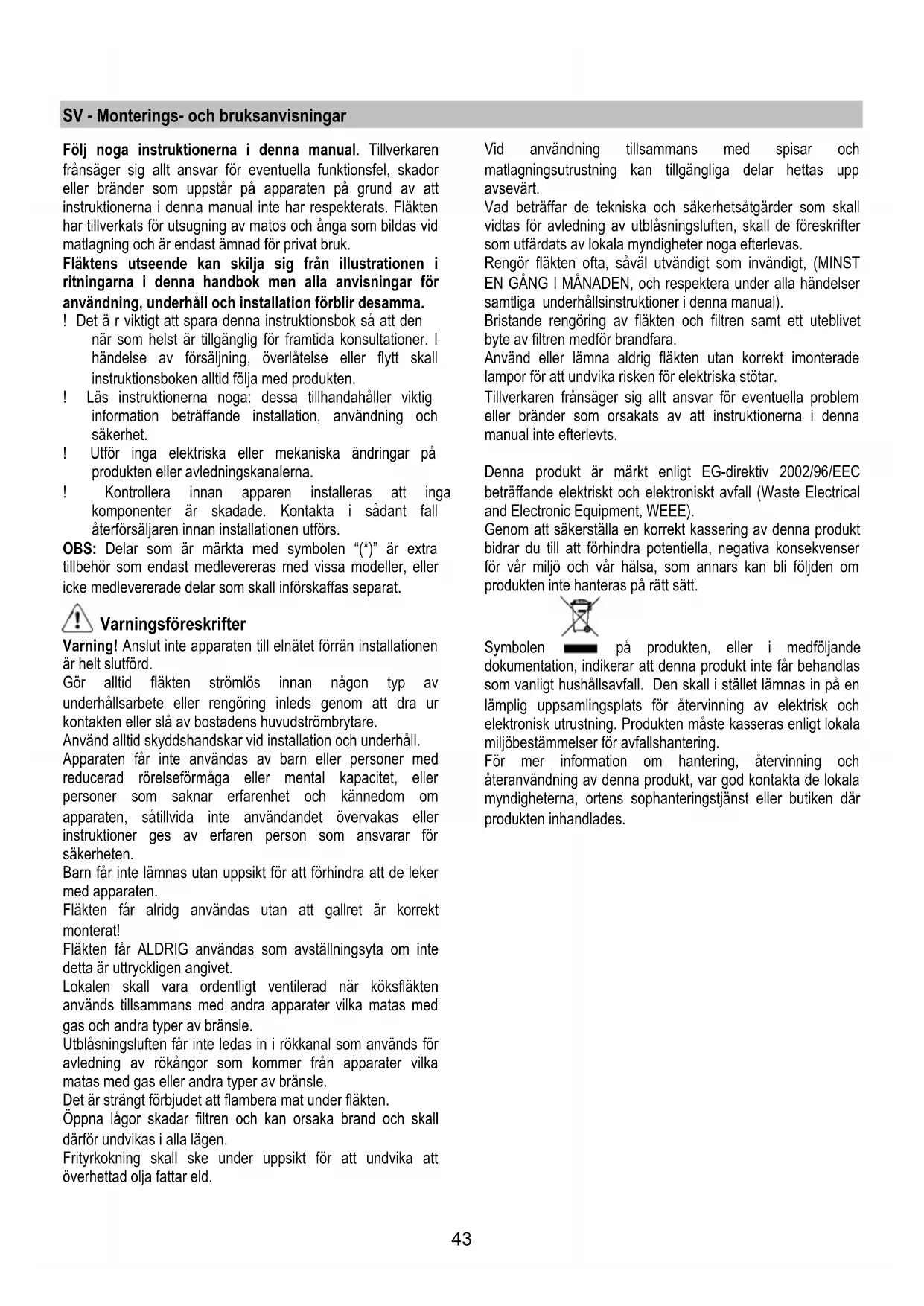 Για την αντικατάσταση τους, απευθυνθείτε στην υπηρεσία τεχνικής βοήθειας43 SV - Monterings- och bruksanvisningar Följ noga instruktionerna i denna manual. Tillverkaren frånsäger sig allt ansvar för eventuella funktionsfel, skador eller bränder som uppstår på apparaten på grund av att instruktionerna i denna manual inte har respekterats. Fläkten har tillverkats för utsugning av matos och ånga som bildas vid matlagning och är endast ämnad för privat bruk. Fläktens utseende kan skilja sig från illustrationen i ritningarna i denna handbok men alla anvisningar för användning, underhåll och installation förblir desamma. ! Det ä r viktigt att spara denna instruktionsbok så att den när som helst är tillgänglig för framtida konsultationer. I händelse av försäljning, överlåtelse eller flytt skall instruktionsboken alltid följa med produkten. ! Läs instruktionerna noga: dessa tillhandahåller viktig information beträffande installation, användning och säkerhet. ! Utför inga elektriska eller mekaniska ändringar på produkten eller avledningskanalerna. ! Kontrollera innan apparen installeras att inga komponenter är skadade. Kontakta i sådant fall återförsäljaren innan installationen utförs. OBS: Delar som är märkta med symbolen “(*)” är extra tillbehör som endast medlevereras med vissa modeller, eller icke medlevererade delar som skall införskaffas separat. Varningsföreskrifter Varning! Anslut inte apparaten till elnätet förrän installationen är helt slutförd. Gör alltid fläkten strömlös innan någon typ av underhållsarbete eller rengöring inleds genom att dra ur kontakten eller slå av bostadens huvudströmbrytare. Använd alltid skyddshandskar vid installation och underhåll. Apparaten får inte användas av barn eller personer med reducerad rörelseförmåga eller mental kapacitet, eller personer som saknar erfarenhet och kännedom om apparaten, såtillvida inte användandet övervakas eller instruktioner ges av erfaren person som ansvarar för säkerheten. Barn får inte lämnas utan uppsikt för att förhindra att de leker med apparaten. Fläkten får alridg användas utan att gallret är korrekt monterat! Fläkten får ALDRIG användas som avställningsyta om inte detta är uttryckligen angivet. Lokalen skall vara ordentligt ventilerad när köksfläkten används tillsammans med andra apparater vilka matas med gas och andra typer av bränsle. Utblåsningsluften får inte ledas in i rökkanal som används för avledning av rökångor som kommer från apparater vilka matas med gas eller andra typer av bränsle. Det är strängt förbjudet att flambera mat under fläkten. Öppna lågor skadar filtren och kan orsaka brand och skall därför undvikas i alla lägen. Frityrkokning skall ske under uppsikt för att undvika att överhettad olja fattar eld. Vid användning tillsammans med spisar och matlagningsutrustning kan tillgängliga delar hettas upp avsevärt. Vad beträffar de tekniska och säkerhetsåtgärder som skall vidtas för avledning av utblåsningsluften, skall de föreskrifter som utfärdats av lokala myndigheter noga efterlevas. Rengör fläkten ofta, såväl utvändigt som invändigt, (MINST EN GÅNG I MÅNADEN, och respektera under alla händelser samtliga underhållsinstruktioner i denna manual). Bristande rengöring av fläkten och filtren samt ett uteblivet byte av filtren medför brandfara. Använd eller lämna aldrig fläkten utan korrekt imonterade lampor för att undvika risken för elektriska stötar. Tillverkaren frånsäger sig allt ansvar för eventuella problem eller bränder som orsakats av att instruktionerna i denna manual inte efterlevts. Denna produkt är märkt enligt EG-direktiv 2002/96/EEC beträffande elektriskt och elektroniskt avfall (Waste Electrical and Electronic Equipment, WEEE). Genom att säkerställa en korrekt kassering av denna produkt bidrar du till att förhindra potentiella, negativa konsekvenser för vår miljö och vår hälsa, som annars kan bli följden om produkten inte hanteras på rätt sätt. Symbolen på produkten, eller i medföljande dokumentation, indikerar att denna produkt inte får behandlas som vanligt hushållsavfall. Den skall i stället lämnas in på en lämplig uppsamlingsplats för återvinning av elektrisk och elektronisk utrustning. Produkten måste kasseras enligt lokala miljöbestämmelser för avfallshantering. För mer information om hantering, återvinning och återanvändning av denna produkt, var god kontakta de lokala myndigheterna, ortens sophanteringstjänst eller butiken där produkten inhandlades.44 Användning Fläkten har tillverkats för att användas som utsugningsversion med utvändig evakuering eller som filterversion med intern återcirkulation. Utsugningsversion Matoset leds ut ur lokalen med hjälp av ett avledningsrör som är fixerat på anslutningsflänsen. Avledningsröret skall ha samma diameter som anslutningsflänsen. Varning! Avledningsröret medlevereras inte och skall införskaffas separat. Röret skall, även när det är horisontellt draget, alltid luta lätt (cirka 10°) uppåt, så att luften lätt kan ledas ut ur lokalen. I det fall fläkten är försedd med kolfilter skall dessa tas ur. Rören och utloppsöppningarna i väggen med vilka fläkten skall anslutas bör ha samma diameter som luftutsläppet (anslutningsflänsen). I det fall man använder rör och utloppsöppningar i väggen med mindre diameter medför detta en lägre utblåsprestanda och en drastisk förhöjning av bullernivån. Vi avsäger oss därför allt ansvar gällande denna typ av problem. ! Använd ett så kort rör som möjligt. ! Röret skall vara så rakt som möjligt (högsta tillåtna vinkel på böjarna 90°). ! Undvik stora skillnader i rörets tvärsnittsarea. ! Använd rör vars insida är så slät som möjligt. ! Röret skall vara tillverkat av i lag godkända material. Filterversion De