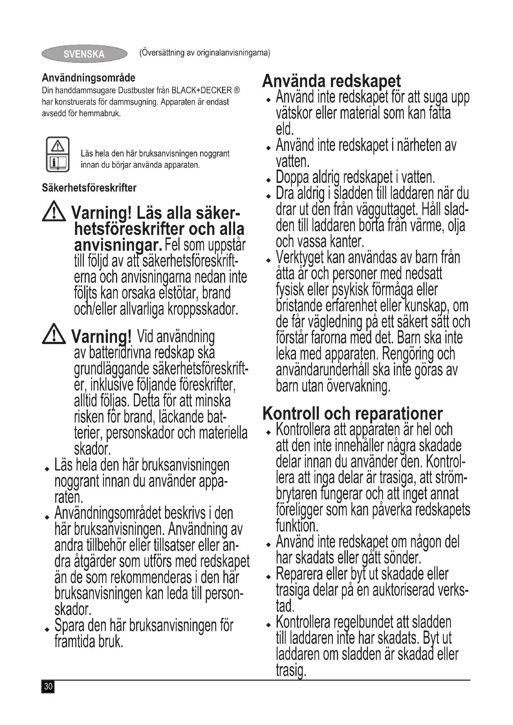 Insamling av uttjänta produkter och förpackningsma- terial gör att material kan återanvändas. Användning av återvunnet material minskar föroreningar av miljön och behovet av råmaterial. Lokala föreskrifter kan kräva separat insamling av elprodukter från hushållen, vid kommunala insamlingsplatser eller hos återförsäljaren när du köper en ny produkt. BLACK+DECKER samlar in och återvinner uttjänta BLACK +DECKER-produkter. Om du vill utnyttja denna tjänst återlämnar du produkten till en auktoriserad verkstad, som samlar in den för vår räkning. För information om närmaste auktoriserade verkstad, kontakta det lokala BLACK+DECKER-kontoret på den adress som är angiven i bruksanvisningen. En lista över alla auktoriserade BLACK+DECKER-verkstäder samt fullständiga servicevillkor och kontaktuppgifter finns på Internet: www.2helpU.com33 (Översättning av originalanvisn- ingarna) SVENSKA (Oversettelse av de opprinnelige instruksjonene) NORSK Garanti Black & Decker garanterar att produkten är fri från material- och/eller fabrikationsfel vid leverans till kund. Garantin gäller utöver konsumentens rättigheter enligt lag och påverkar inte dessa. Garantin gäller inom medlemsstaterna i Europeiska Unionen och i det Europeiska Frihandelsområdet. Om en Black & Decker-produkt går sönder på grund av material- och/eller fabrikationsfel eller brister i överensstäm- melse med specikationen, inom 24 månader från köpet, åtar sig Black & Decker att reparera eller byta ut produkten med minsta besvär för kunden, förutom om: u Produkten har använts i kommersiellt eller yrkesmässigt syfte eller i uthyrningssyfte. u Produkten har utsatts för felaktig användning eller skötsel.u Produkten har skadats av främmande föremål, ämnen eller genom olyckshändelse. u Reparation har utförts av någon annan än en auktoriserad Black & Decker-verkstad. Vid garantianspråk ska produkten och inköpskvittot lämnas till återförsäljaren eller till en auktoriserad verkstad. För information om närmaste auktoriserade verkstad, kontakta det lokala Black & Decker-kontoret på den adress som är angiven i bruksanvisningen. En lista över alla auktoriserade Black & Decker-verkstäder samt fullständiga servicevillkor och kontaktuppgifter nns på Internet: www.2helpU.com Besök vår webbplats www.blackanddecker.se för att registrera din nya Black & Decker-produkt samt för att erhålla informa- tion om nya produkter och specialerbjudanden. Mer informa- tion om märket Black & Decker och vårt produktsortiment nns på www.blackanddecker.se Glöm inte att registrera din produkt! www.blackanddecker.se/productregistration Registrera din produkt online på www.blackanddecker.se/productregistration eller skicka in för- och efternamn och produktkod till Black & Decker i ditt land. Bruksområde Den håndholdte støvsugeren Dustbuster® fra BLACK +DECKER er konstruert for støvsuging. Apparatet er bare beregnet for bruk i hjemmet. Les hele denne håndboken nøye før du bruker apparatet. Sikkerhetsinstruksjoner