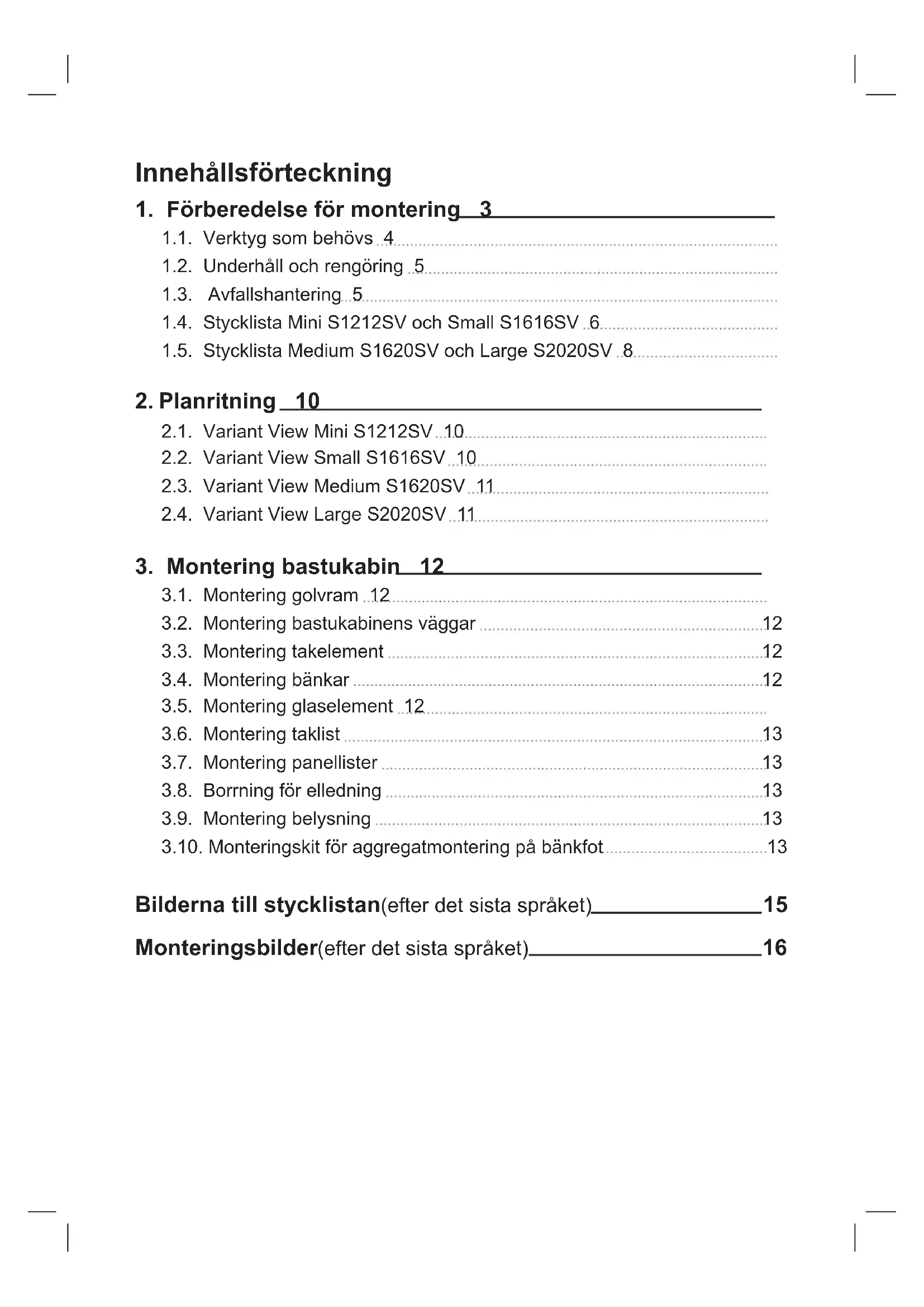 3.1. Montering golvram 12 3.2. Montering bastukabinens väggar 12 3.3. Montering takelement 12 3.4. Montering bänkar 12 3.5. Montering glaselement 12 3.6. Montering taklist 13 3.7. Montering panellister 13 3.8. Borrning för elledning 13 3.9. Montering belysning 13 3.10. Monteringskit för aggregatmontering på bänkfot 13 Bilderna till stycklistan(efter det sista språket) 15 Monteringsbilder (efter det sista språket) 16SV Monteringsanvisning sid. 3/14