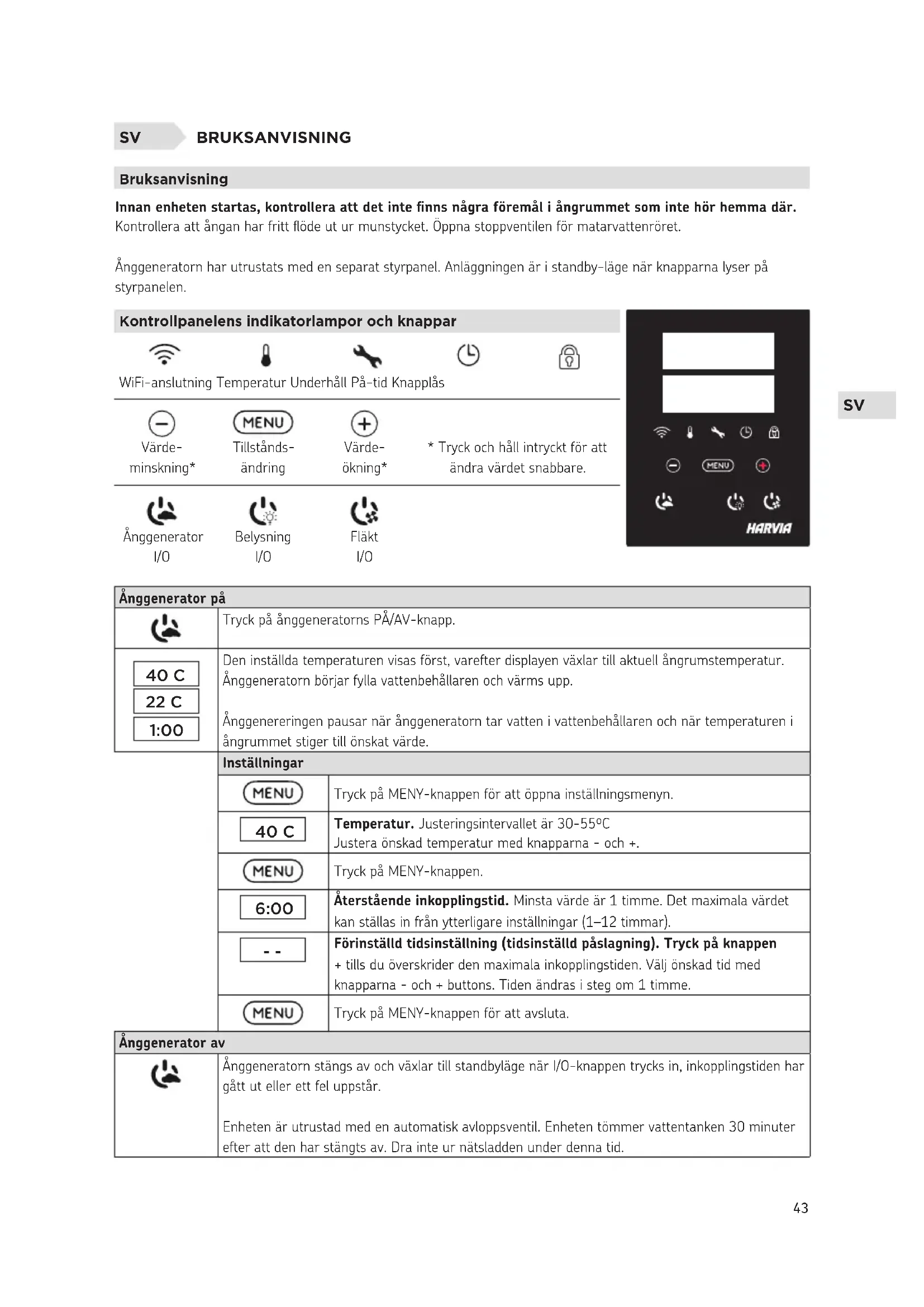Förinställd tidsinställning (tidsinställd påslagning). Tryck på knappen + tills du överskrider den maximala inkopplingstiden. Välj önskad tid med knapparna - och + buttons. Tiden ändras i steg om 1 timme. Tryck på MENY-knappen för att avsluta. Ånggenerator av Ånggeneratorn stängs av och växlar till standbyläge när I/O-knappen trycks in, inkopplingstiden har gått ut eller ett fel uppstår. Enheten är utrustad med en automatisk avloppsventil. Enheten tömmer vattentanken 30 minuter efter att den har stängts av. Dra inte ur nätsladden under denna tid.SV