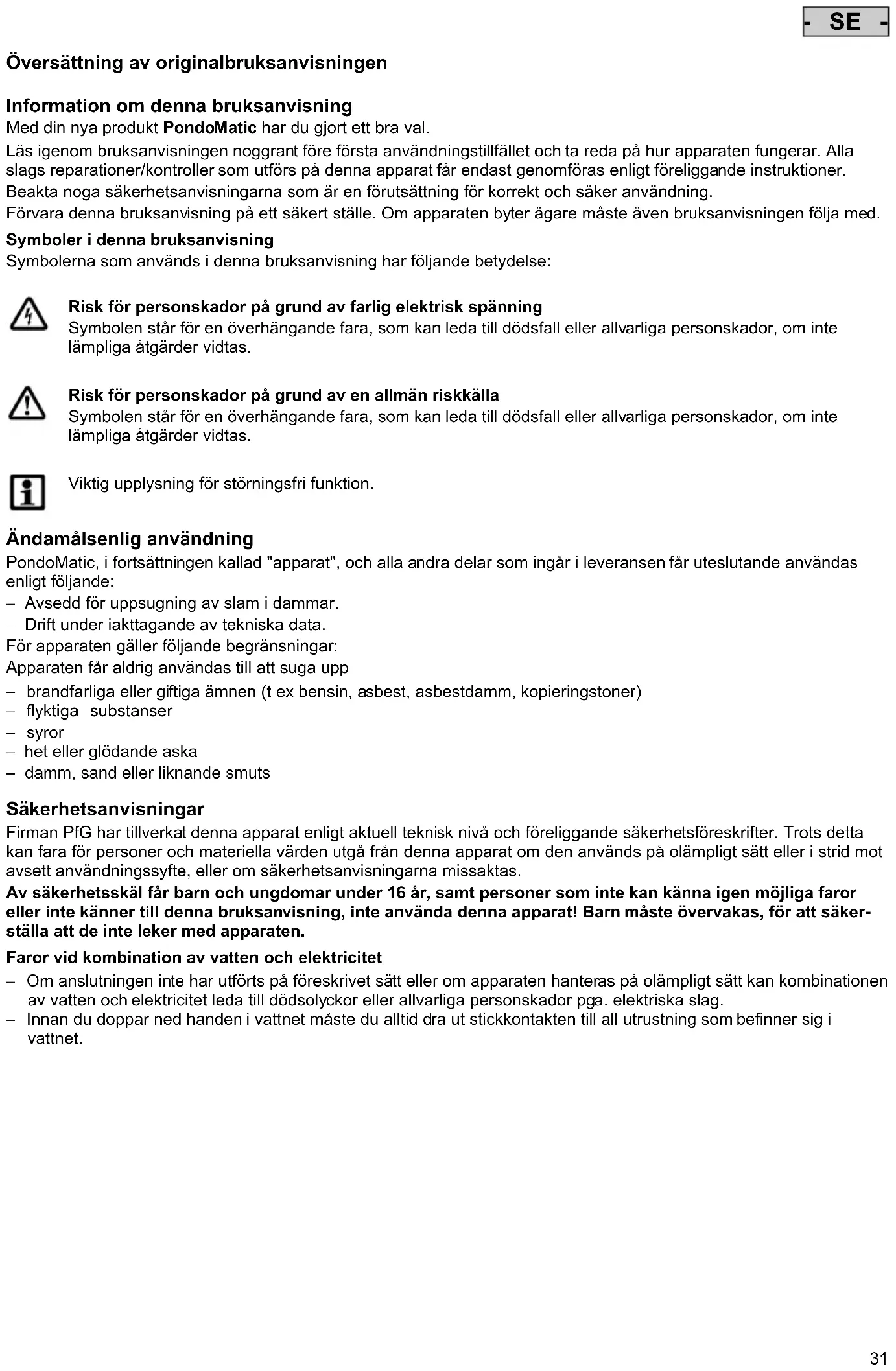 LatendastbehörigaPfG-kundtjänstverkstäderrepareraapparaten. - Använd inte apparaten om personer befinner sig i vattnet.