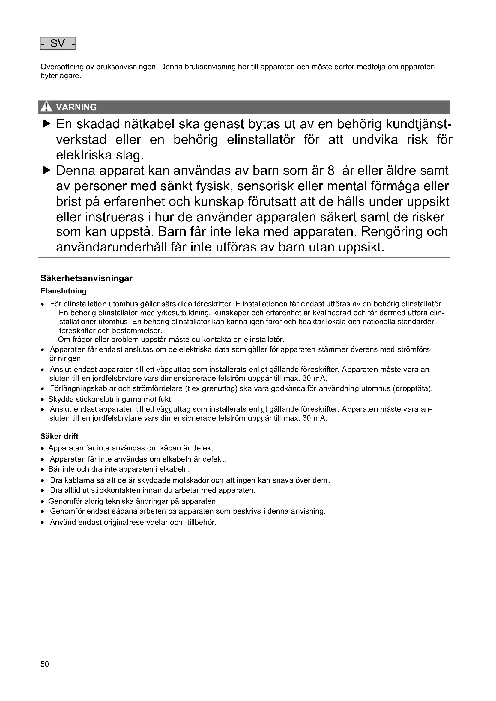 - SV - Översättning av bruksanvisningen. Denna bruksanvisning hör till apparaten och måste därför medfölja om apparaten byter ägare.