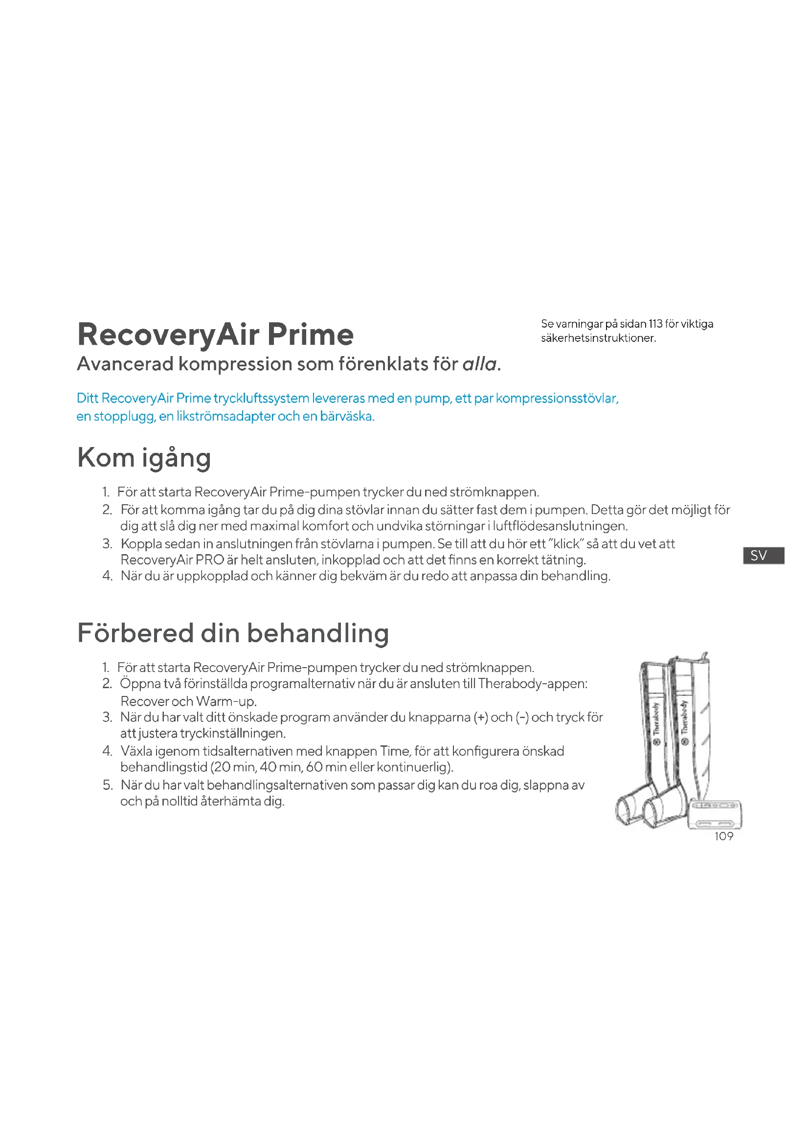 och på nolltid återhämta dig. RecoveryAir Prime Ditt RecoveryAir Prime tryckluftssystem levereras med en pump, ett par kompressionsstövlar, en stopplugg, en likströmsadapter och en bärväska. Avancerad kompression som förenklats för alla. Se varningar på sidan 113 för viktiga säkerhetsinstruktioner.