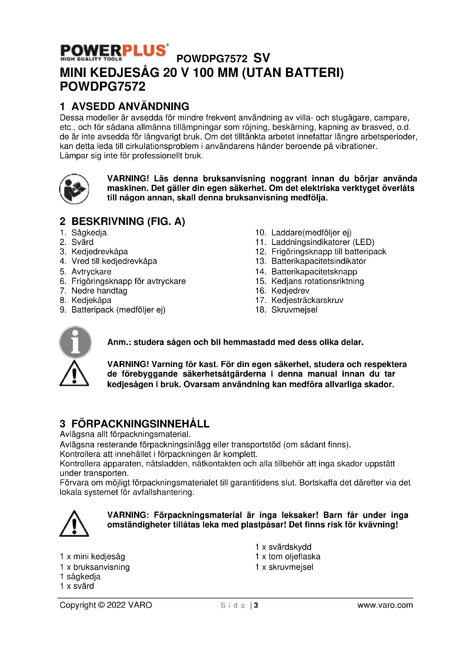 - Snåla aldrig med kedjesmörjolja till svärd och kedja. Att köra sågen torr eller med för litet olja minskar skäreffektiviteten, förkortar sågkedjans livslängd, gör att kedjan snabbt blir slö, och leder till snabb förslitning av svärdet på grund av överhettning. För litet olja ger sig till känna genom rökutveckling och av att svärdet missfärgas. 14 TEKNISKA DATA Modell POWDPG7572 Spänning 20 V Sågbladets längd 100 mm Svärdets skärlängd 90 mm Kedjedelning 7,6 mm (0,30”) Kedjetjocklek 1,1 mm (0,043”) Kedjedrivhjul 6 tänderPOWDPG7572 SV Copyright © 2022 VARO S i d a | 13 www.varo.com 15 BULLER Bullervärden uppmätta i enlighet med relevanta standarder. (K=3) Ljudtrycksnivå LpA 77 dB(A) Ljudeffektnivå LwA 88 dB(A) OBS! Bär hörselskydd när ljudtrycket överstiger 85 dB(A). aw (Vibration) 2,5 m/s² K = 1,5 m/s² 16 GARANTI