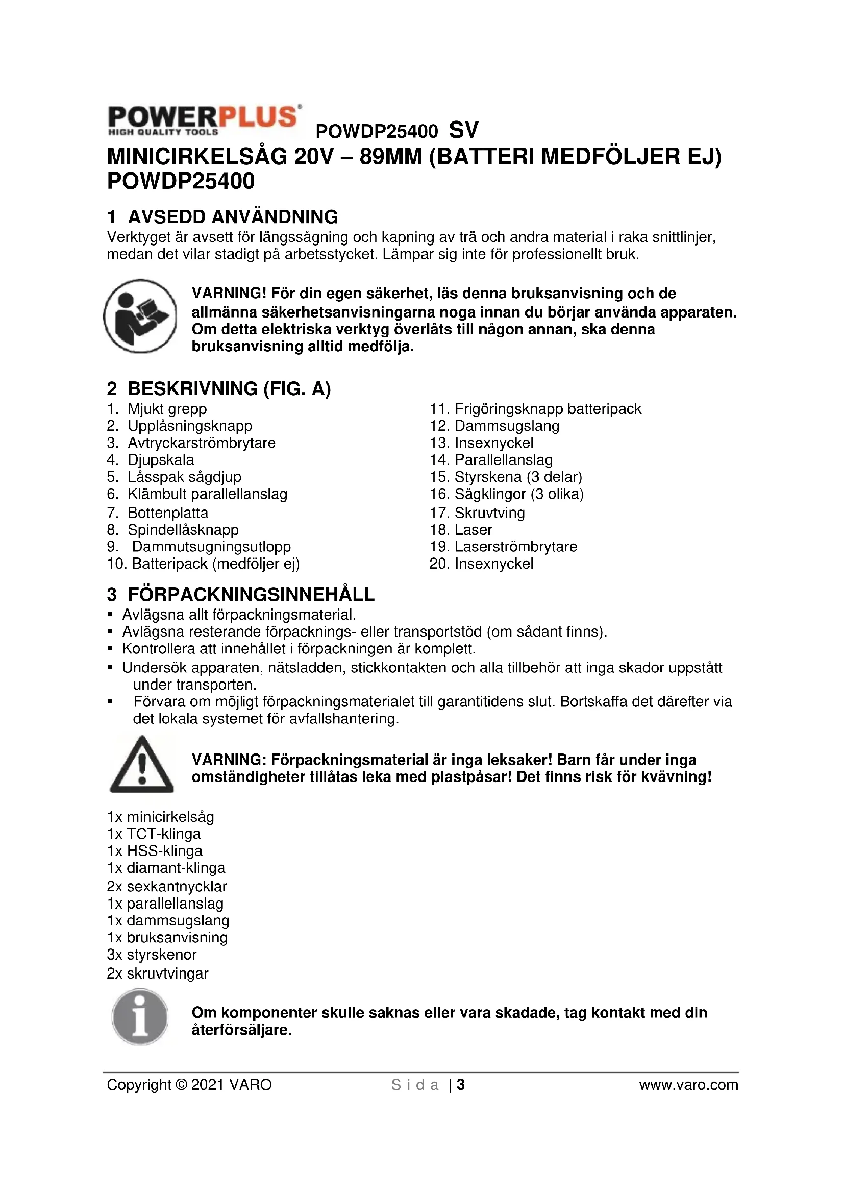 - Såga inte i mycket små arbetsstycken. Vid sågning i rundvirke, använd en anordning som hindrar att arbetsstycket vrids. Håll aldrig arbetsstycket som ska sågas med handen eller över benet. Det är viktigt att arbetsstycket görs fast ordentligt, för att minska risken för att komma i kontakt med sågklingan, att den fastnar eller att du tappar kontrollen över sågen.POWDP25400 SV Copyright © 2021 VARO S i d a | 7 www.varo.com