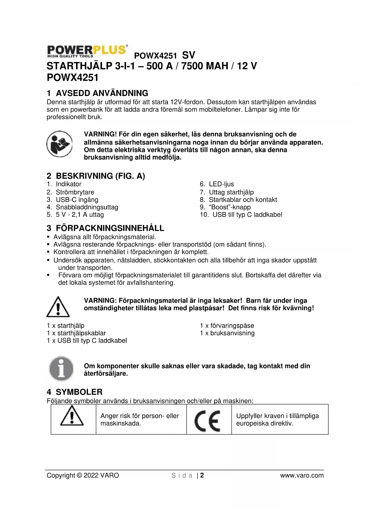 Då produkten tjänat ut får den inte lämnas med det vanliga hushållsavfallet utan ska deponeras på miljömässigt korrekt sätt och enligt gällande lokala bestämmelser. Avfall som kommer från elektriska maskinkomponenter får inte hanteras som vanligt hushållsavfall. De ska deponeras för återvinning där återvinningscentraler finns att tillgå. Kontakta lokala myndigheter eller din återförsäljare för närmare information om återvinning.POWX4251 SV Copyright © 2022 VARO S i d a | 8 www.varo.com