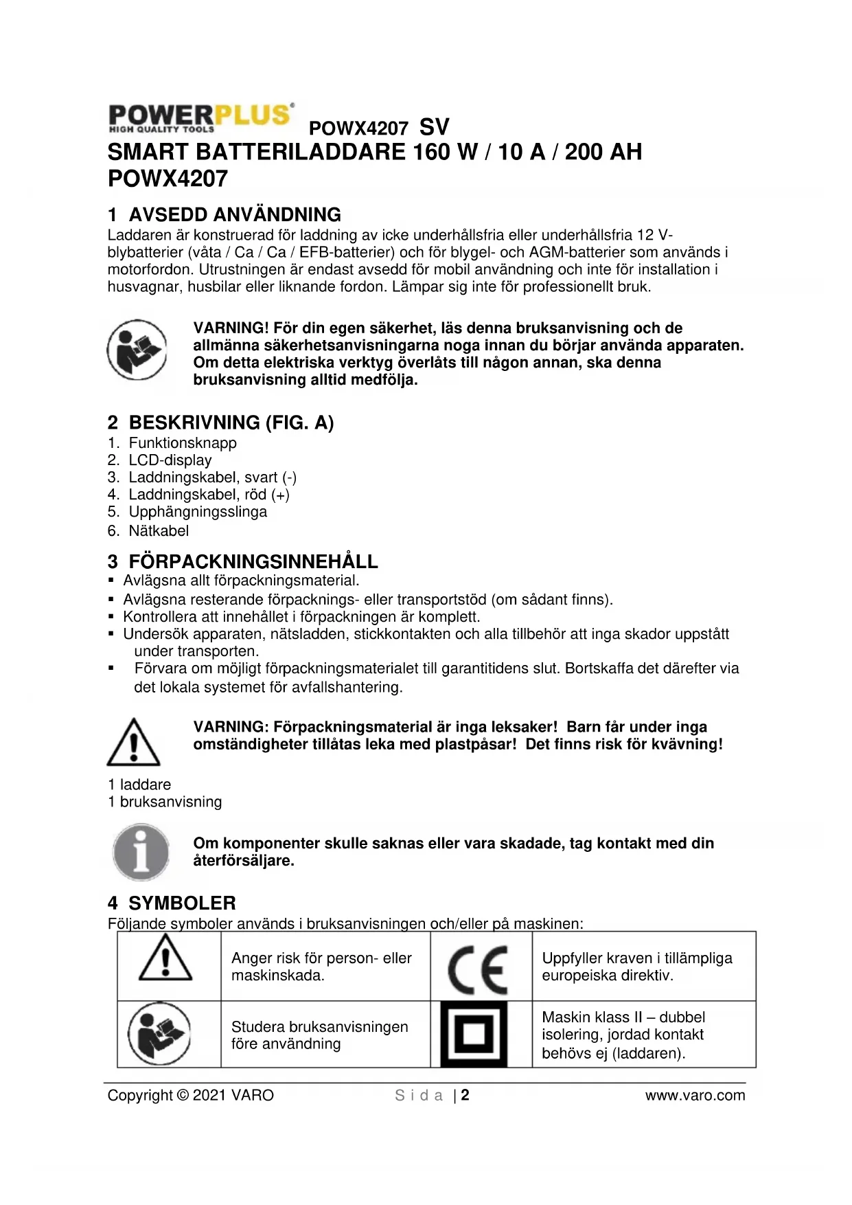 - Utrustningen får inte användas för att ladda uppladdningsbara litiumjärnfosfatbatterier eller andra uppladdningsbara litiumbatterier.POWX4207 SV Copyright © 2021 VARO S i d a | 5 www.varo.com 7 ANVÄNDNING Innan utrustningen ansluts till strömförsörjningen, se till att data på specifikationsetiketten är identiska med matningsspänningen. VARNING: Ladda inte frysta batterier.
