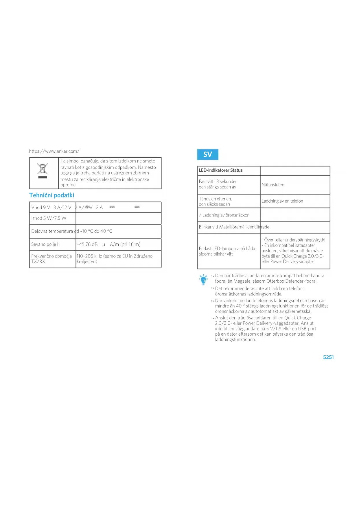 Rengör endast produkten med en torr trasa eller borste. Den här produkten uppfyller EU-kraven för radiointerferens. Försäkran om efterlevnad Härmed förklarar Anker Innovations Limited att produkttypen A2568 överensstämmer med direktiven 2014/53/EU och 2011/65/ EU. EU-försäkran om efterlevnad finns att läsa i sin helhet på följande webbadress: https://www.anker.com/ Den här symbolen indikerar att den här produkten inte ska behandlas som hushållsavfall. Den ska istället lämnas över till tillämplig insamlingspunkt för återvinning av elektrisk och elektronisk utrustning. Specifikationer Ineffekt 9 V 3 A/12 V 2 A/15 V 2 A Uteffekt 5 W/7,5 W Drifttemperatur -10 °C - 40 °C Strålat H-fält -45,76dBμ A/m(vid10m) Frekvensområde för sändning/mottagning 110–205kHz (endast för EU och Storbritannien)5655