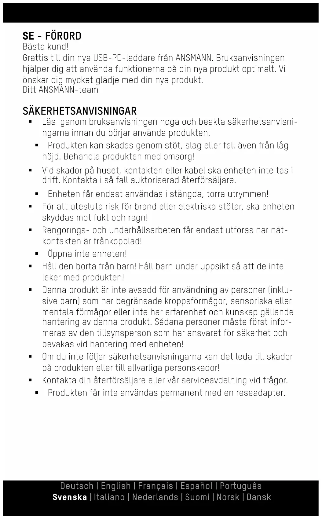 O aparelho tem uma garantia de três anos. A garantia exclui danos no aparelho decorrentes da inobservância das instruções de operação. Sujeito a alterações técnicas. Não nos responsabilizamos por erros de impressão. 06/2019 Os nossos regulamentos da garantia podem ser consultados em www. ansmann.deSE - FÖRORD Bästa kund! Grattis till din nya USB-PD-laddare från ANSMANN. Bruksanvisningen hjälper dig att använda funktionerna på din nya produkt optimalt. Vi önskar dig mycket glädje med din nya produkt. Ditt ANSMANN-team SÄKERHETSANVISNINGAR Läs igenom bruksanvisningen noga och beakta säkerhetsanvisni- ngarna innan du börjar använda produkten. Produkten kan skadas genom stöt, slag eller fall även från låg höjd. Behandla produkten med omsorg! Vid skador på huset, kontakten eller kabel ska enheten inte tas i drift. Kontakta i så fall auktoriserad återförsäljare. Enheten får endast användas i stängda, torra utrymmen! För att utesluta risk för brand eller elektriska stötar, ska enheten skyddas mot fukt och regn! Rengörings- och underhållsarbeten får endast utföras när nät- kontakten är frånkopplad! Öppna inte enheten! Håll den borta från barn! Håll barn under uppsikt så att de inte leker med produkten! Denna produkt är inte avsedd för användning av personer (inklu- sive barn) som har begränsade kroppsförmågor, sensoriska eller mentala förmågor eller inte har erfarenhet och kunskap gällande hantering av denna produkt. Sådana personer måste först infor- meras av den tillsynsperson som har ansvaret för säkerhet och bevakas vid hantering med enheten! Om du inte följer säkerhetsanvisningarna kan det leda till skador på produkten eller till allvarliga personskador! Kontakta din återförsäljare eller vår serviceavdelning vid frågor. Produkten får inte användas permanent med en reseadapter. Deutsch | English | Français | Español | Português Svenska | Italiano | Nederlands | Suomi | Norsk | DanskDRIFTSÄTTNING PD- kompatibel PD- kompatibel USB Type-C PD-kompatibel Snabbladdning Hög effekt