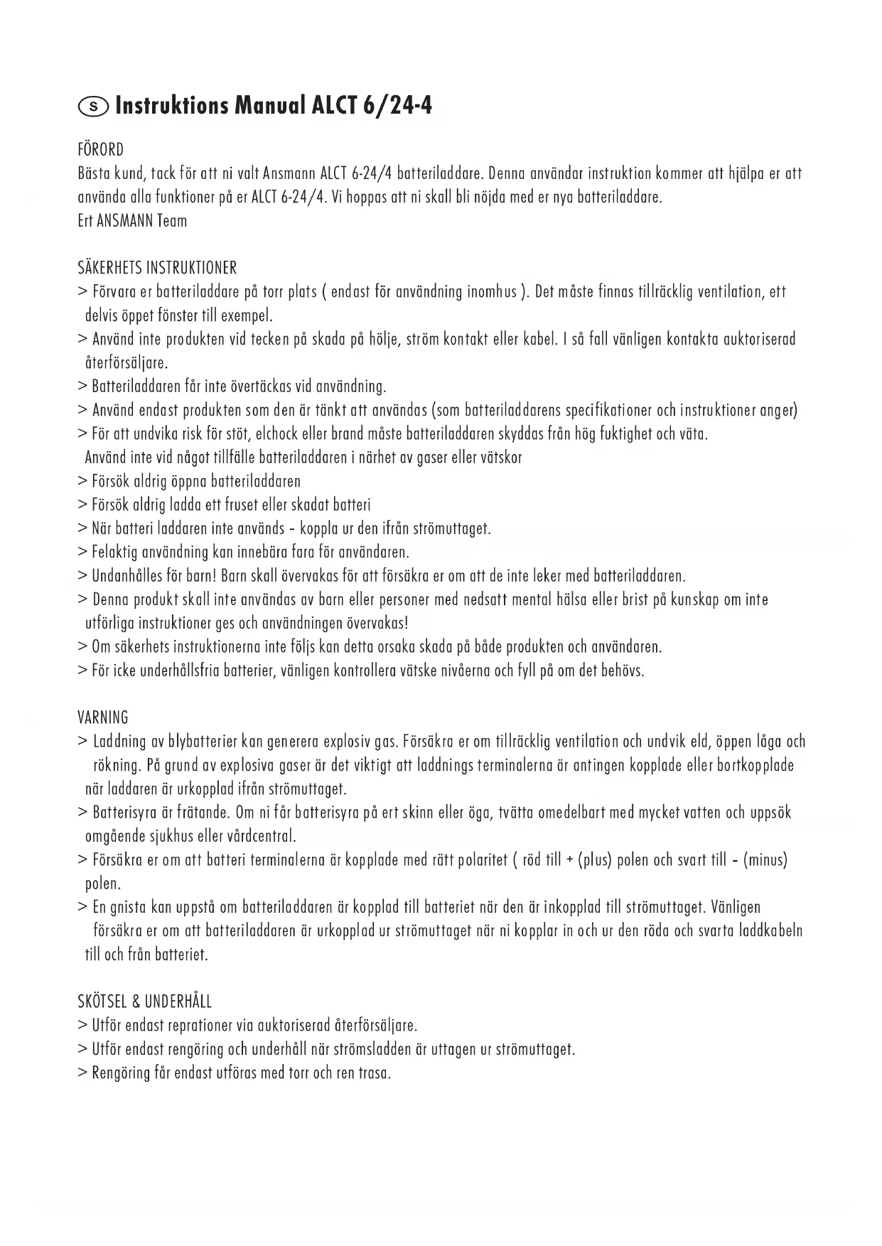 Informationen I denna manual kan ändras utan förvarning. ANSMANN förutsätter inga skyldigheter för direkt eller in- direkt, olycka eller följdskador orsakade av felktigt användning eller att denna manual inte följts eller bortsetts ifrån. GARANTI INFORMATION ANSMANN erbjuder 3-års garanti på denna produkt. Ingen garanti ges för skada på batteriladdaren som uppstått på grund av förbisende av dessa instruktioner. Denna information kan ändras utan förvarning. ANSMANN tar inget ansvar för eventuella tryckfel. 06/2014 Návod na používanie ALCT 6/24-4 Vážená zákazníčka, vážený zákazník, ďakujeme vám, že ste sa rozhodli pre nabíjačku ACLT 6-24/4 spoločnosti ANSMANN. Predložený návod na používanie vám pomôže optimálne využívať funkcie nabíjačky ACLT 6-24/4. Pred používaním nabíjačky si preto prosím prečítajte tento návod na používanie. Želáme vám veľa spokojnosti pri používaní vašej novej nabíjačky. Váš tím ANSMANN
