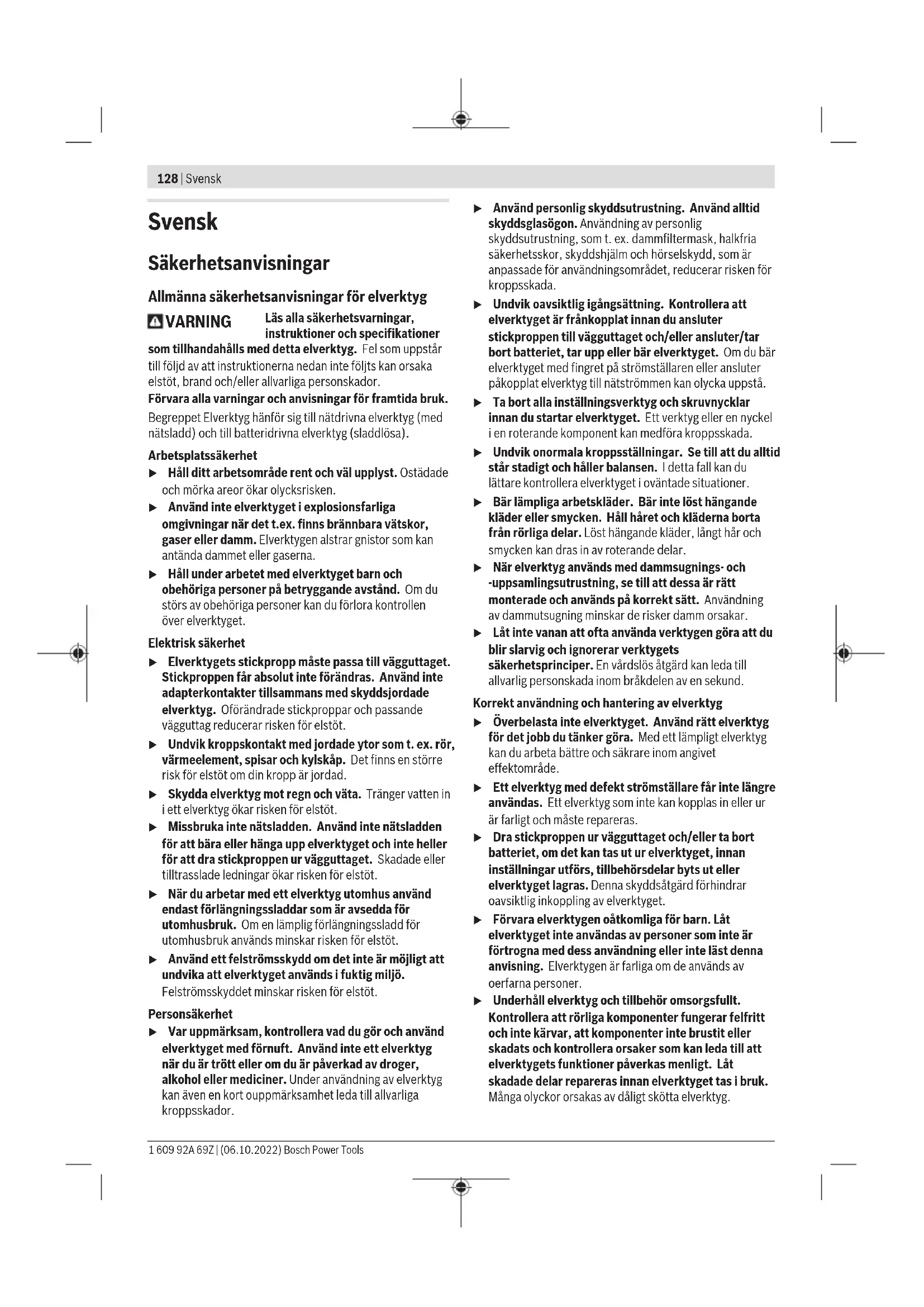 A) Gäller endast GWS17-125SB och GWS17-125PSB: använd inte skivborstar med innergänga. Vrid växellådshuvudet (se bildE) u Dra stickproppen ur nätuttaget innan arbeten utförs på elverktyget. Du kan vrida växelhuvudet i steg om 90°. Då kan på-/av- strömbrytaren placeras i en bättre hanteringsposition vid speciella arbetsfall, t.ex. för vänsterhänta personer. Skruva ut de 4 skruvarna helt och hållet(➊). Sväng växelhuvudet försiktigt och utan att ta av det från kåpan till den nya positionen(➋). Dra åt de 4 skruvarna igen(➌). Demontera dammfiltret (se bildF ochG ) Skjut av dammfiltret(4) på undersidan av elverktyget, i pilens riktning. Ta inte tag i dammfiltret(4) från sidan för att ta av det. Damm-/spånutsugning Dammet från material som t.ex. blyhaltig målning, vissa träslag, mineraler och metall kan vara hälsovådligt. Beröring eller inandning av dammet kan orsaka allergiska reaktioner och/eller andningsbesvär hos användaren eller personer som uppehåller sig i närheten. Vissa damm från ek eller bok anses vara cancerogena, speciellt då i förbindelse med tillsatsämnen för träbehandling (kromat, träkonserveringsmedel). Endast yrkesmän får bearbeta asbesthaltigt material. – Använd om möjligt en för materialet lämplig dammutsugning. – Se till att arbetsplatsen är väl ventilerad. – Vi rekommenderar ett andningsskydd i filterklass P2. Beakta de föreskrifter som i aktuellt land gäller för bearbetat material. u Undvik dammanhopning på arbetsplatsen. Damm kan lätt självantändas. Drift u Belasta inte elverktyget så mycket att det stannar.u Dra stickproppen ur nätuttaget innan arbeten utförs på elverktyget. u Var försiktig vid spårning i bärande väggar. Se avsnittet "Information om statiken". u Spänn upp arbetsstycket, såvida det inte ligger säkert på grund av sin egenvikt. u Om elverktyget använts under hög belastning, låt det gå några minuter på tomgång för avkylning av tillsatsverktyget. u Elverktyget får inte användas med ett kapbord.u Rör inte slip- och kapskivorna innan de svalnat. Skivorna blir mycket heta vid arbetet. Arbetsanvisningar Skrubbning u Använd alltid skyddskåpa för slipning (11)vid skrubbslipning med bundna slipmedel. 1 609 92A 69Z | (06.10.2022) Bosch Power ToolsSvensk | 139 u Använd aldrig kapskivor för skrubbning. u Vid skrubbslipning kan skyddskåpan för kapning (12) eller skyddskåpan för slipning (11) med monterat lock för kapning (13) stöta mot arbetsstycket vilket leder till förlust av kontrollen över verktyget. Med en ställvinkel på 30° till 40° får du det bästa resultatet vid skrubbning. Flytta elverktyget med måttfullt tryck fram och tillbaka. Då blir materialet inte för varmt, missfärgas inte, och det blir inga repor. u Vid användning av bundna skivor som är tillåtna både för kapning och slipning måste skyddshuven för kapning (12) resp. skyddshuven för slipning (11) med monterat lock för kapning (13) användas. Ytslipning med solfjäderslipskiva u Använd alltid skyddskåpa för slipning (11) vid slipning med solfjäderslipskiva. Med solfjäderslipskivan (tillbehör) kan också välvda ytor och profiler bearbetas. Solfjädersslipskivor har en avsevärt längre livslängd, lägre bullernivå och lägre sliptemperaturer än konventionella slipskivor. Ytslipning med sliprondell u Montera alltid handskyddet(26) vid arbeten med gummisliptallriken (27). Slipning med sliprondell kan göras utan skyddskåpa. Monteringens ordningsföljd framgår av grafiksidan. Skruva fast rundmuttern(29) och spänn den med tvåstiftsnyckeln. Koppborste/skivborste/konformad borste u Använd alltid skyddskåpan för slipning (11) vid borstning med skivborste. Borstning med koppborste/konformad borste kan göras utan skyddskåpa. u Montera alltid handskyddet (26) med koppborste eller konformad borste. u Borsten på skivborsten kan fastna i skyddskåpan och gå av om max. tillåtna mått för skivborstarna överskrids. Monteringens ordningsföljd framgår av grafiksidan. Koppborsten/den konformade borsten/skivborsten ska gå att skruva så långt på slipspindeln så att den ligger an fast mot slipspindelflänsen i slutet av slipspindelgängningen. Spänn fast koppborsten/den konformade borsten/ skivborsten med en gaffelnyckel. För att fästa skivborsten med diameter 22,22mm sätter du fästflänsen med O-ringen (14) på slipspindeln (25), skruvar på rundmuttern (29) och drar åt den med tvåstiftsnyckeln. Kapning av metall u Vid kapning av metall med bundna kapskivor eller med diamant-kapskivor, använd alltid skyddskåpan för kapning (12) resp. skyddskåpan för slipning (11) med monterat lock för kapning (13). u Vid användning av skyddskåpan för slipning (11) för kapning med bundna kapskivor föreligger en ökad risk för gnistor och partiklar samt skivfragment vid skivbrott. Arbeta med måttfull frammatning vid kapning, som är anpassad till materialet. Utöva inget tryck på kapningsskivan och förvrid och oscillera den inte. Bromsa inte in den utgående kapningsskivan genom att trycka emot på sidan. Elverktyget måste alltid föras med motrotation. Annars föreligger risk för att den trycks ut ur kapningen okontrollerat. Vid kapning av profiler och fyrkantsrör är det bäst att sätta an där diametern är som minst. Kapning av sten u Vid kapning av sten med bundna kapskivor eller med diamantkapskivor, använd alltid utsugskåpan för kapning med styrsläde (34) eller skyddskåpa för kapning (12) eller skyddskåpan för slipning (11) med monterat lock för kapning (13). u Vid kapning i sten bör en tillräckligt god dammutsugning anordnas. u Bär dammskyddsmask. u Elverkyget får endast användas för torrkapning/ torrslipning. u Vid användning av skyddskåpan för kapning (12), skyddskåpan för slipning (11) eller skyddskåpan för slipning (11) med monterat lock för kapning (13) vid kapning och slipning i betong eller murverk föreligger en ökad risk fö