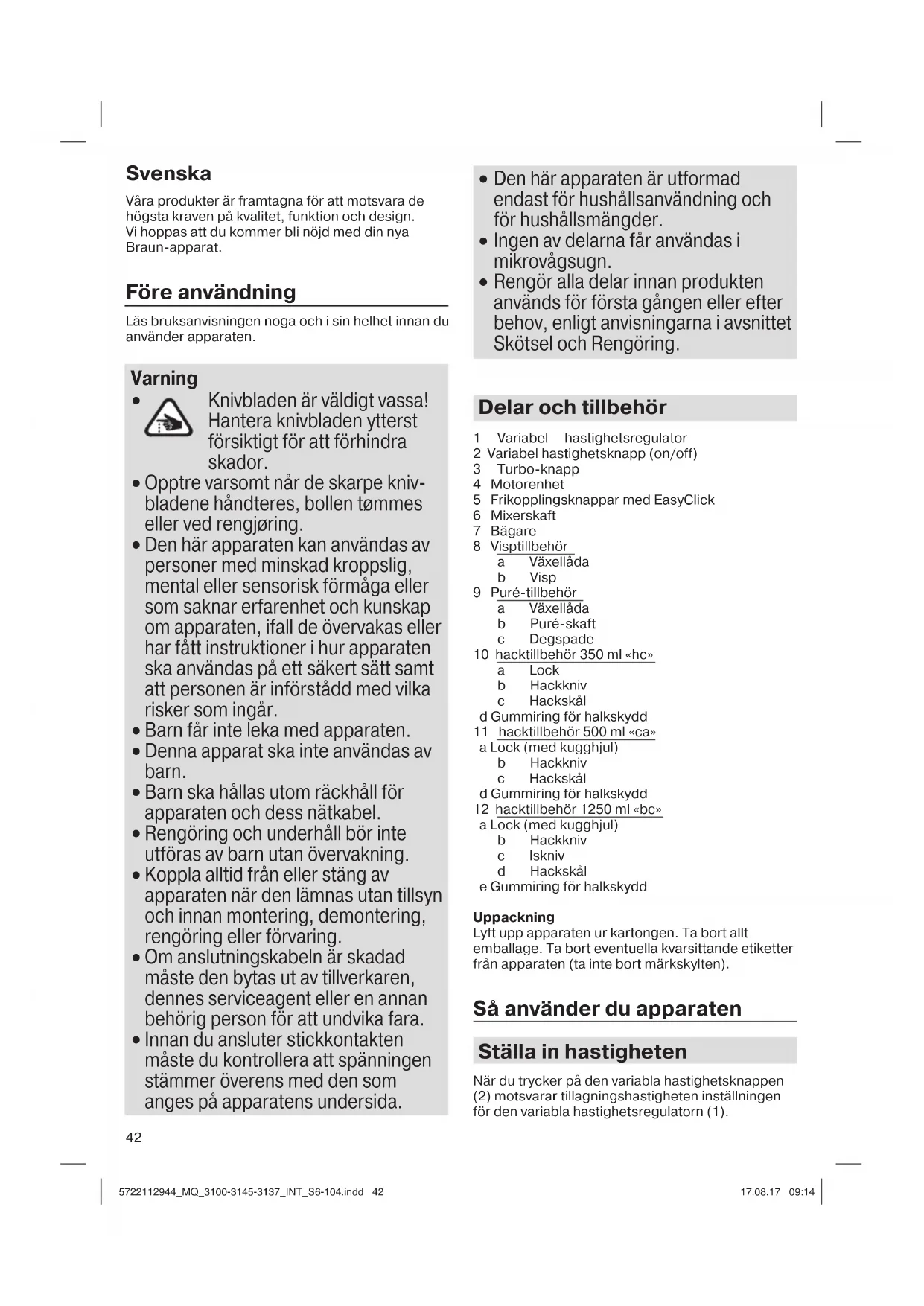 Rengör alla delar innan produkten används för första gången eller efter behov, enligt anvisningarna i avsnittet Skötsel och Rengöring. Delar och tillbehör 1 Variabel hastighetsregulator 2 Variabel hastighetsknapp (on/off) 3 Turbo-knapp 4 Motorenhet 5 Frikopplingsknappar med EasyClick 6 Mixerskaft 7 Bägare 8 Visptillbehör a Växellåda b Visp 9 Puré-tillbehör a Växellåda b Puré-skaft c Degspade 10 hacktillbehör 350 ml «hc» a Lock b Hackkniv c Hackskål d Gummiring för halkskydd 11 hacktillbehör 500 ml «ca» a Lock (med kugghjul) b Hackkniv c Hackskål d Gummiring för halkskydd 12 hacktillbehör 1250 ml «bc» a Lock (med kugghjul) b Hackkniv c Iskniv d Hackskål e Gummiring för halkskydd Uppackning Lyft upp apparaten ur kartongen. Ta bort allt emballage. Ta bort eventuella kvarsittande etiketter från apparaten (ta inte bort märkskylten). Så använder du apparaten Ställa in hastigheten När du trycker på den variabla hastighetsknappen (2) motsvarar tillagningshastigheten inställningen för den variabla hastighetsregulatorn (1). 5722112944_MQ_3100-3145-3137_INT_S6-104.indd 425722112944_MQ_3100-3145-3137_INT_S6-104.indd 42 17.08.17 09:1417.08.17 09:1443 Ju högre inställningen är desto snabbare får du ett hackningsresultat. Du kan bekvämt justera hastigheten medan du använder beredaren genom att vrida på hastighetsregulatorn. Maximal tillagningshastighet uppnås när man trycker in Turbo-knappen (3). Du kan också använda Turbo-knappen för direkta och kraftiga pulsrörelser utan att behöva vrida på hastighetsregulatorn. Mixerskaft (A) Handmixern är perfekt att använda vid tillredning av dippar, såser, salladsdressing, soppor, barnmat samt drycker, smoothies och milkshakes. Använd turbohastighet för bästa resultat. Montering och hantering