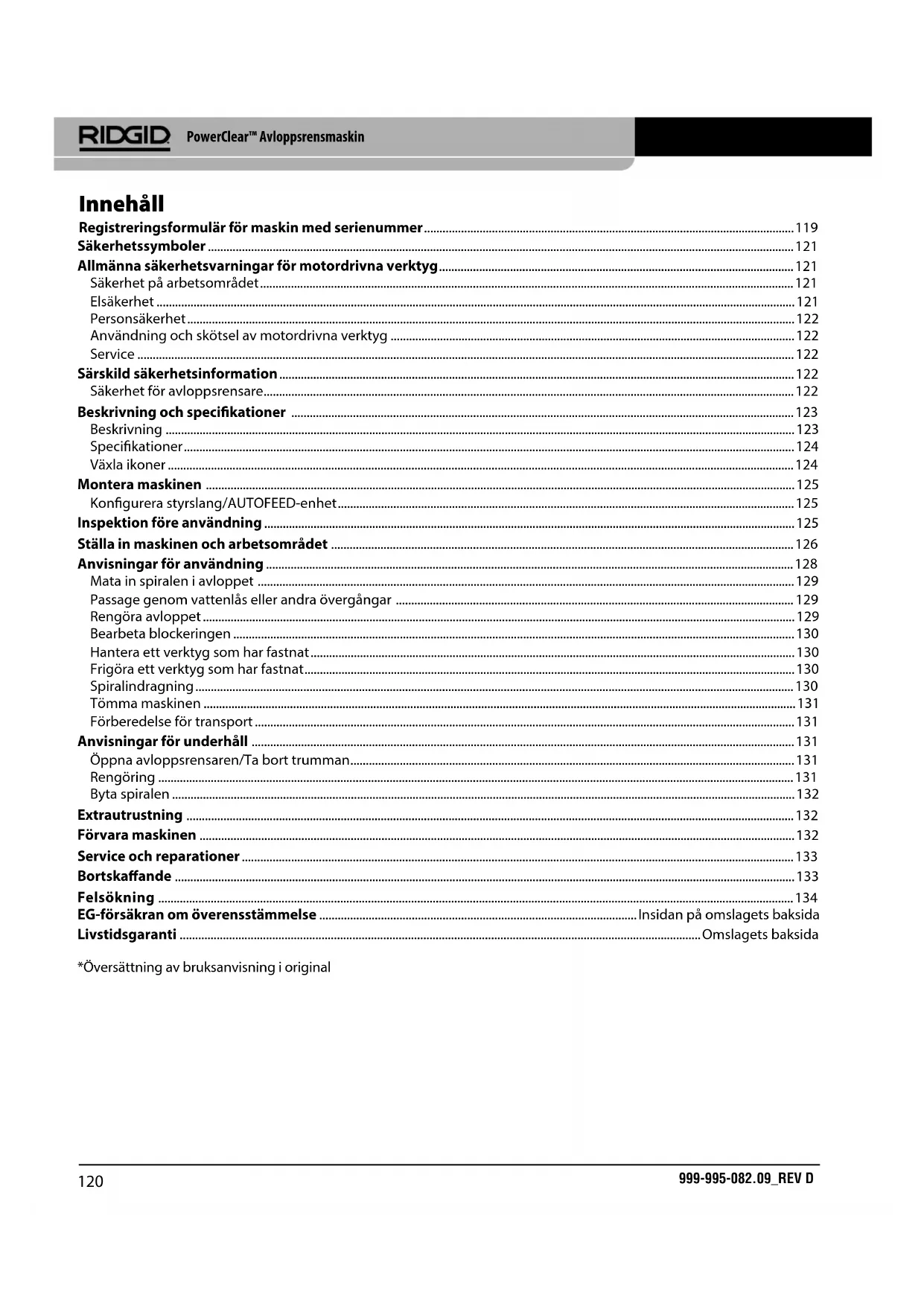 PowerClear™ Avloppsrensmaskin999-995-082.09_REV D Service och reparationer VARNING Felaktigt utförd service eller reparation kan göra ma- skinen osäker att använda. Se avsnittet Anvisningar för underhåll för uppgifter om ser- vice på maskinen Problem som inte beskrivs där måste hanteras av behörig servicetekniker från RIDGID Verktyget ska tas till ett oberoende auktoriserat RIDGID- servicecenter eller återsändas till fabriken För information om närmaste oberoende auktoriserade RIDGID servicecenter eller om du har frågor om service/ reparationer: