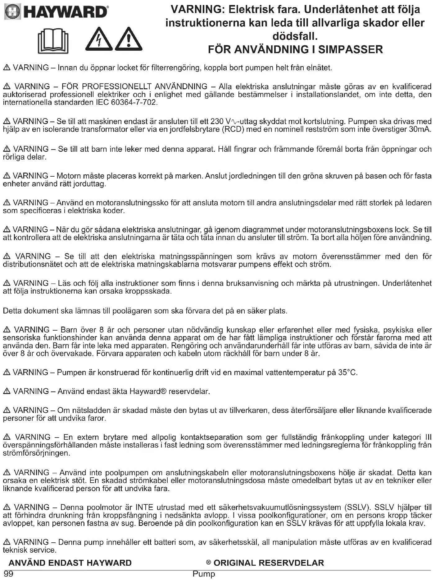 - VIKTIGT: vänta fem minuter efter att helt ha frånkopplat pumpen från elmatningen innan du utför åtgärder på motor eller kopplingsdosa: risk för elstöt som kan leda till döden. De elmotorer som sitter i våra pumpar har motorskydd som reagerar vid överbelastning eller onormal överhettning av motorns lindning. Skyddet återställs automatiskt när lindningens temperatur sjunker. Om så krävs enligt bestämmelserna och oavsett vilken motor som används, måste man utöver ovan angivna anordningar installera ett magnetiskt/termiskt skydd som ska vara kalibrerat enligt anvisningarna på motorns märkplåt. I tabellen på sidan 169 anges egenskaperna för de motorer som sitter i våra pumpar.ANVÄND ENDAST HAYWARD