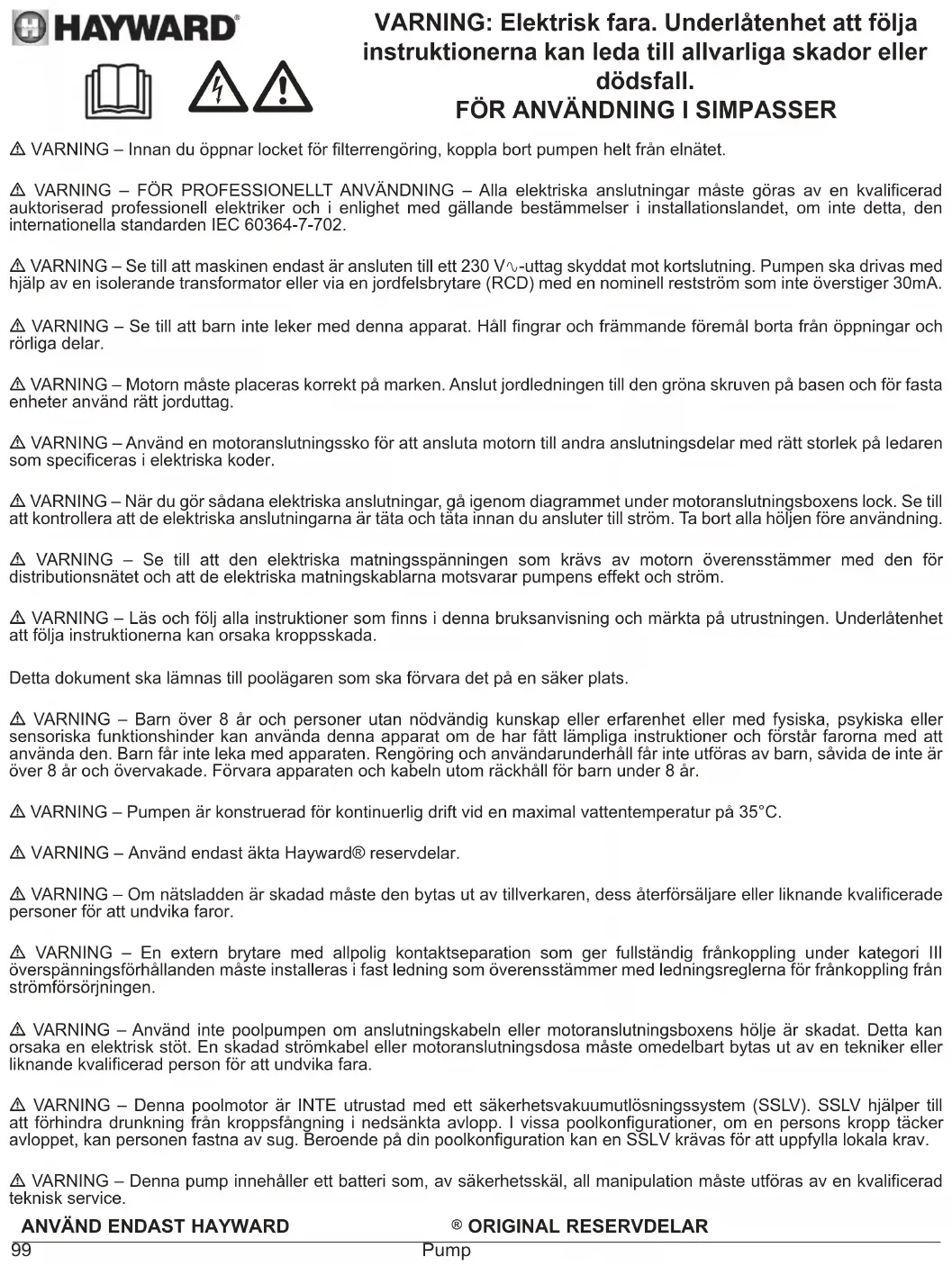 - VIKTIGT: vänta fem minuter efter att helt ha frånkopplat pumpen från elmatningen innan du utför åtgärder på motor eller kopplingsdosa: risk för elstöt som kan leda till döden. De elmotorer som sitter i våra pumpar har motorskydd som reagerar vid överbelastning eller onormal överhettning av motorns lindning. Skyddet återställs automatiskt när lindningens temperatur sjunker. Om så krävs enligt bestämmelserna och oavsett vilken motor som används, måste man utöver ovan angivna anordningar installera ett magnetiskt/termiskt skydd som ska vara kalibrerat enligt anvisningarna på motorns märkplåt. I tabellen på sidan 169 anges egenskaperna för de motorer som sitter i våra pumpar.ANVÄND ENDAST HAYWARD