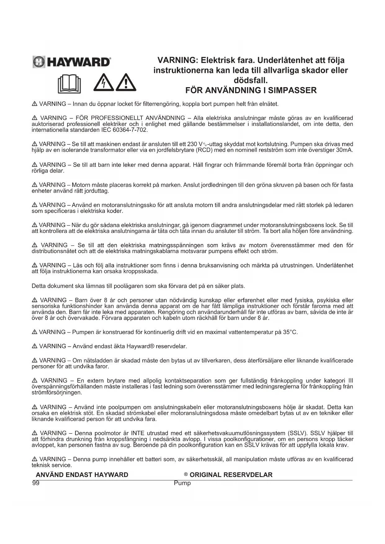 - VIKTIGT: vänta fem minuter efter att helt ha frånkopplat pumpen från elmatningen innan du utför åtgärder på motor eller kopplingsdosa: risk för elstöt som kan leda till döden. De elmotorer som sitter i våra pumpar har motorskydd som reagerar vid överbelastning eller onormal överhettning av motorns lindning. Skyddet återställs automatiskt när lindningens temperatur sjunker. Om så krävs enligt bestämmelserna och oavsett vilken motor som används, måste man utöver ovan angivna anordningar installera ett magnetiskt/termiskt skydd som ska vara kalibrerat enligt anvisningarna på motorns märkplåt. I tabellen på sidan 169 anges egenskaperna för de motorer som sitter i våra pumpar.ANVÄND ENDAST HAYWARD