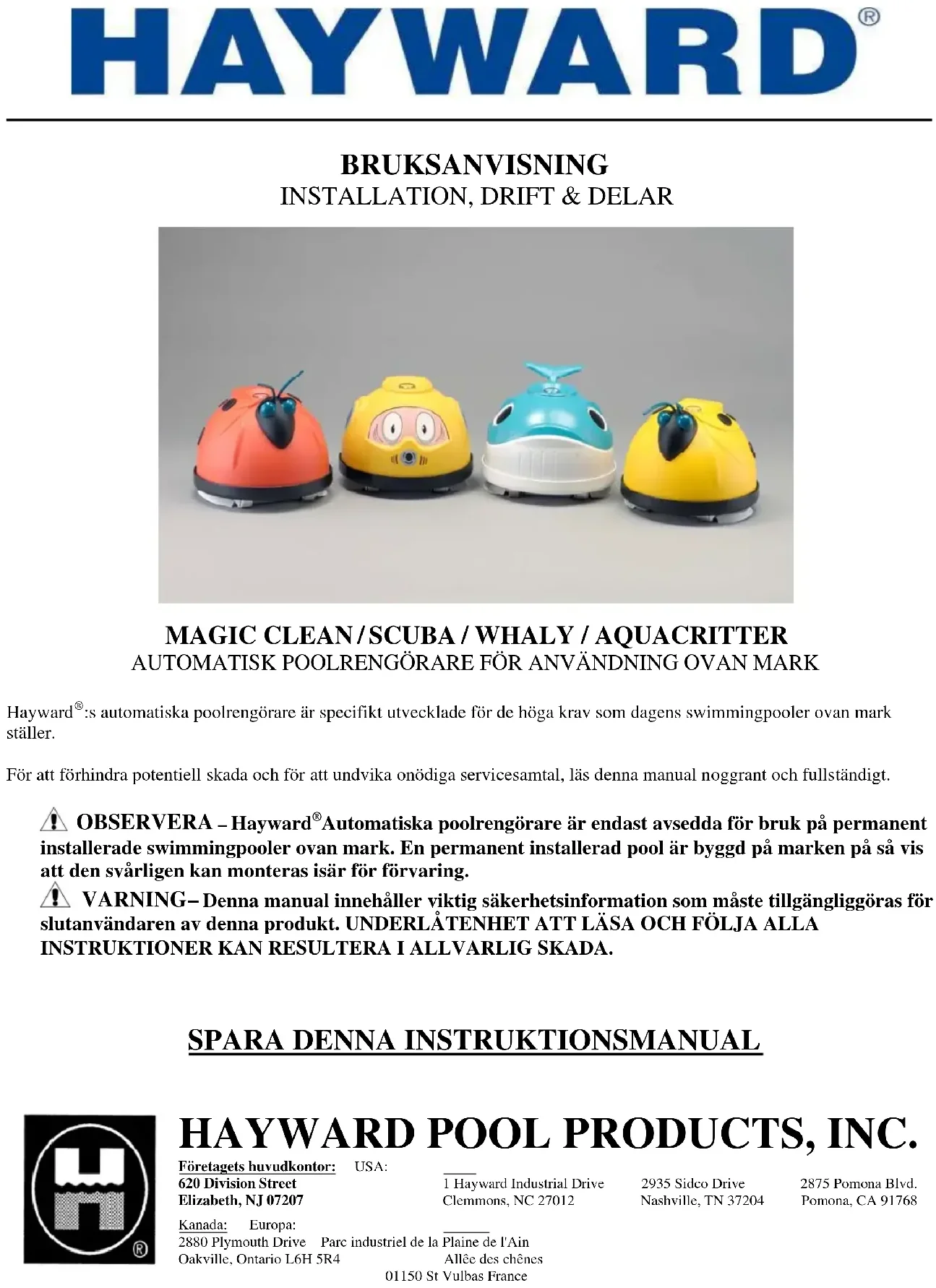 WHALY / AQUACRITTER AUTOMATISK POOLRENGÖRARE FÖR ANVÄNDNING OVAN MARK Hayward :s automatiska poolrengörare är specifikt utvecklade för de höga krav som dagens swimmingpooler ovan mark ställer. För att förhindra potentiell skada och för att undvika onödiga servicesamtal, läs denna manual noggrant och fullständigt.